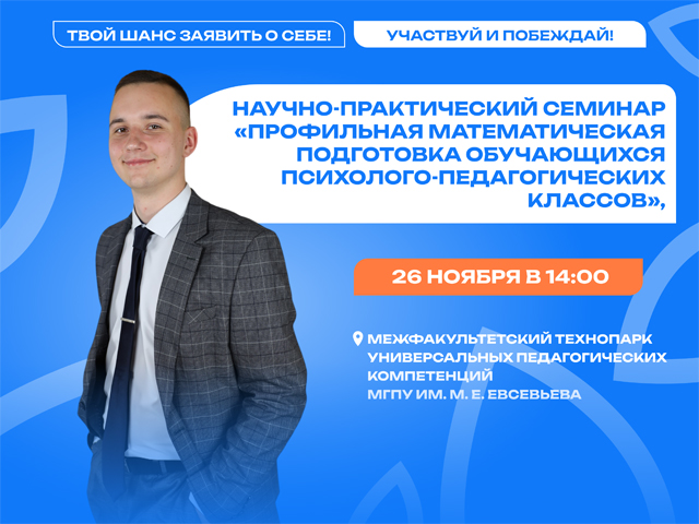 Мордовский государственный педагогический университет имени М. Е. Евсевьева приглашает всех заинтересованных на научно-практический вебинар «Профильная математическая подготовка обучающихся психолого-педагогических классов», организованный кафедрой математики, экономики и методик обучения. Дата и время: 26 ноября 2025г. в 14.00 Место проведения: Межфакультетский Технопарк универсальных педагогических компетенций МГПУ им. М. ...