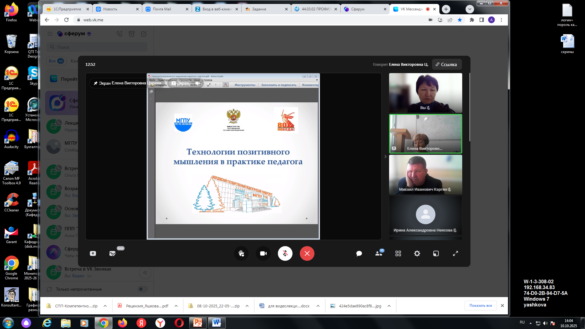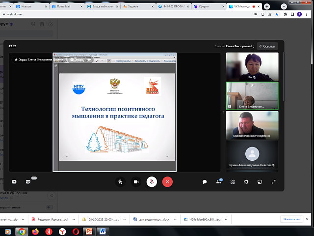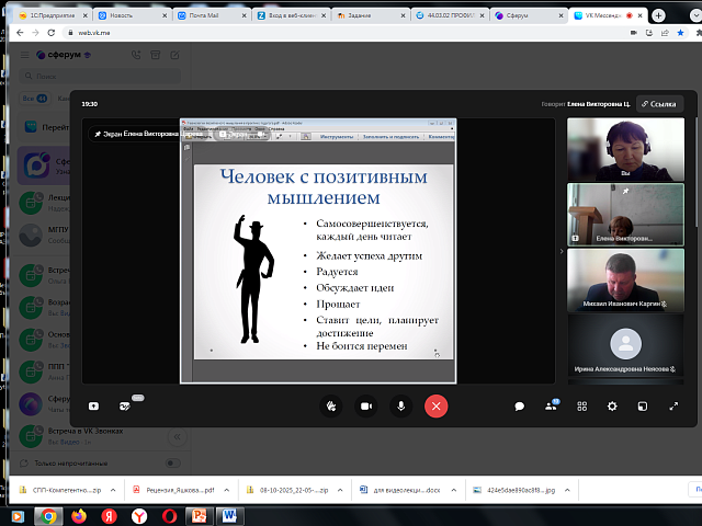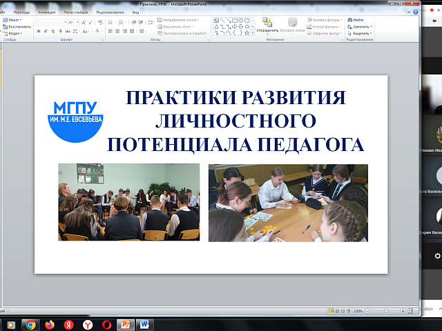 На онлайн-мероприятии были представлены практики развития личностного потенциала современного учителя. Одна из них – технологии развития позитивного мышления как ресурс для преодоления профессиональных нагрузок педагогической деятельности, а другая – технологии профессиональной диагностики обучающихся как инструмент для профотбора и определения индивидуального образовательного маршрута. Диалог с участниками на указанные содержательные аспекты подвел к выводу о том, что личность педагога совершенствуется тогда, когда она оптимистично развивается вместе с современными инновационными преобразованиями в обществе.