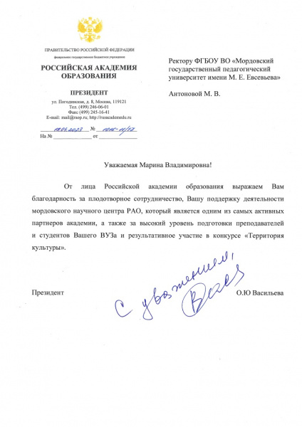 2017 г. № 06 – 17 / 11 о научном сотрудничестве между Российской академией образования и МГПУ и Положении о Мордовском научном центре Российской академии образования.