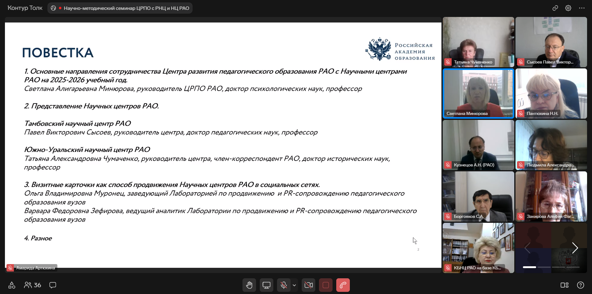 В ходе совещания С. А. Минюрова представила основные направления сотрудничества Центра с научными центрами РАО на 2025/2026 учебный год.