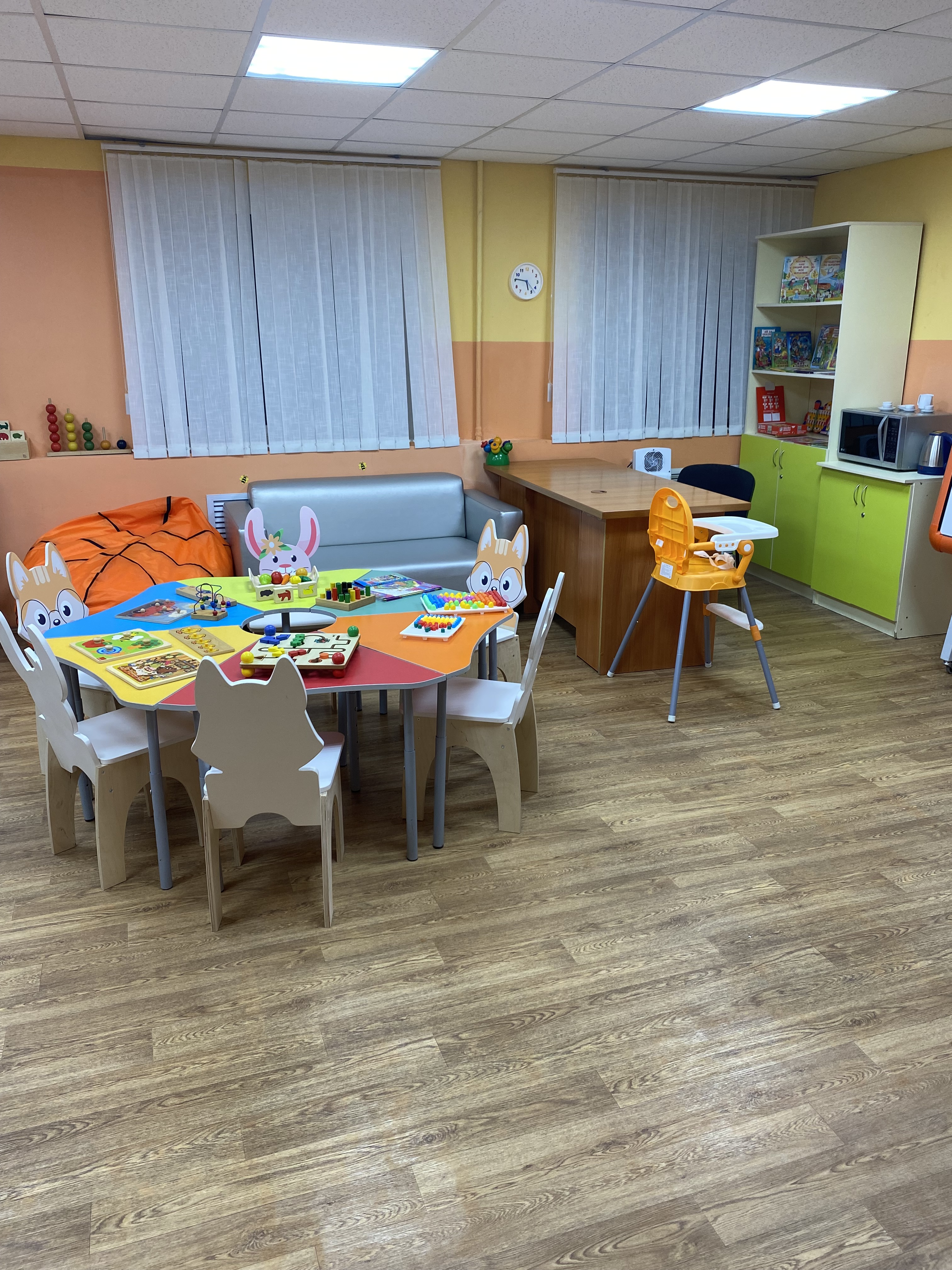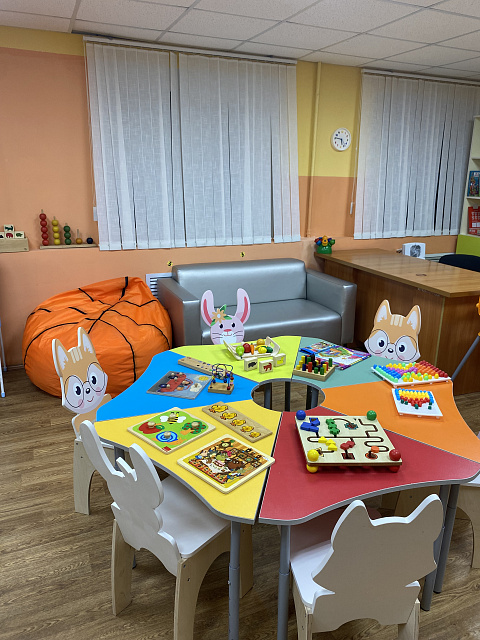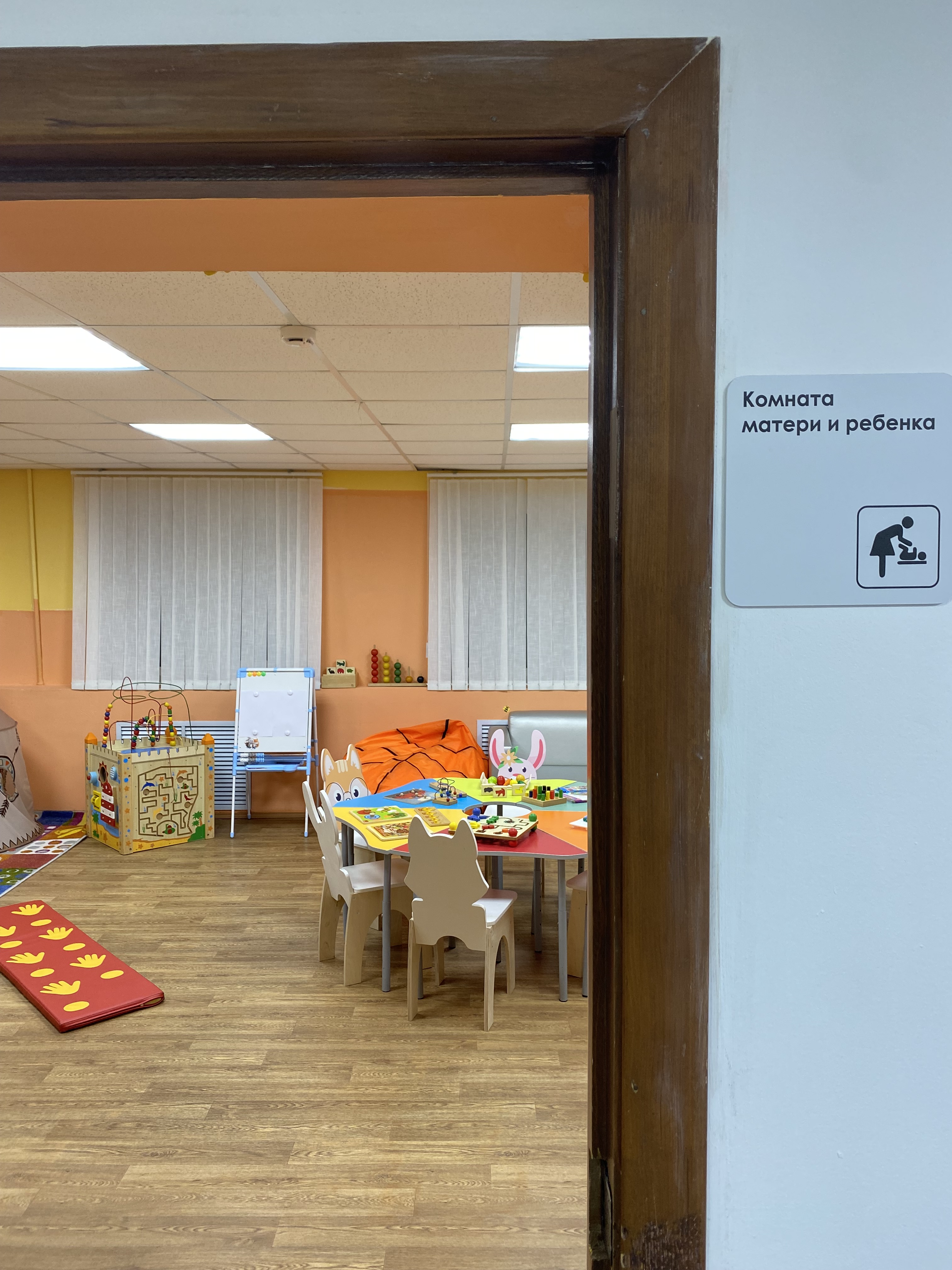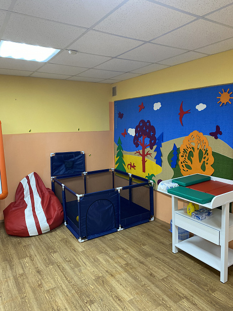 Помещение включает в себя уютные зоны для отдыха, необходимое оборудование для кормления и ухода за детьми. Комната также рассчитана на пребывание детей в возрасте от 1 года до 7 лет. Здесь есть вся необходимая мебель и оборудование, игрушки, материалы для творчества и развития, книги для детей от 1 года до 7 лет. Помощь родителям оказывают педагоги образовательного центра «Пеликан» и волонтёры факультета педагогического и художественного образования..
