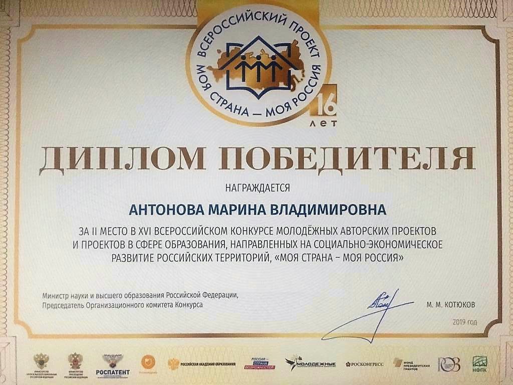 8 июня в рамках Петербургского международного экономического форума – 2019 состоялась Торжественная церемония награждения победителей XVI Всероссийского конкурса молодёжных авторских проектов и проектов в сфере образования, направленных на социально-экономическое развитие российских территорий, «Моя страна - моя Россия», проводимого Российской академией образования при поддержке Министерства науки и высшего образования Российской Федерации.