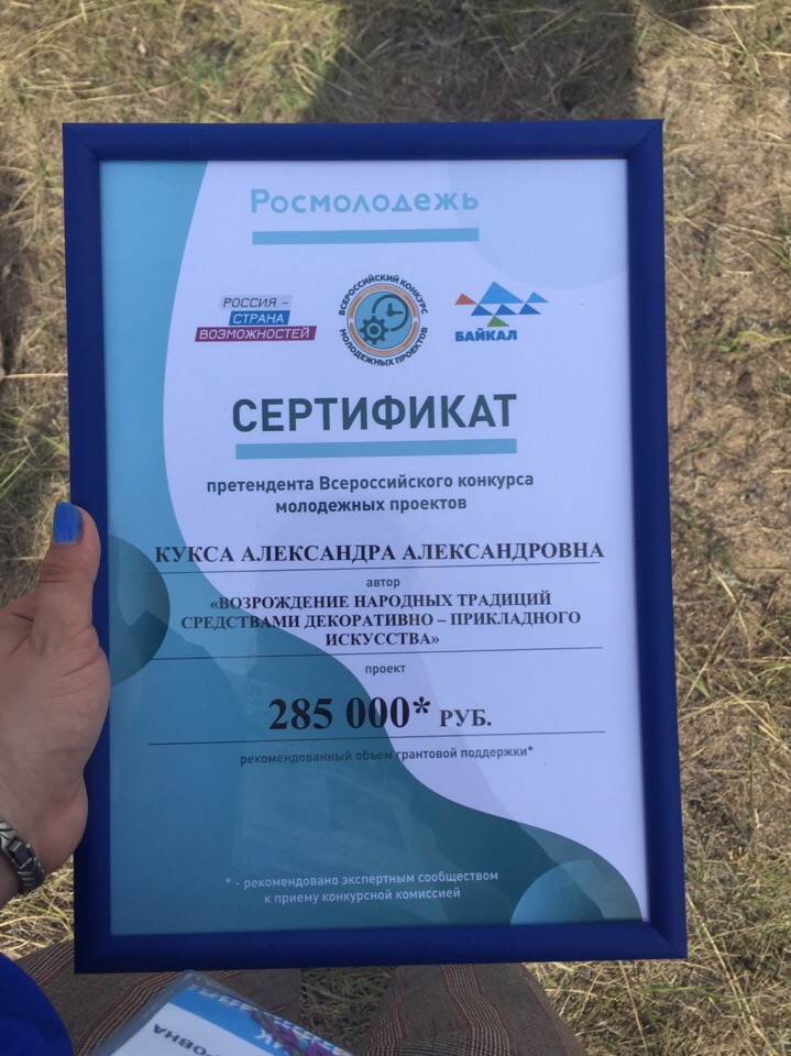 По итогу защиты проект Александры Кукса «Возрождение народных традиций средствами декоративно-прикладного искусства» получил одобрение экспертного сообщества Росмолодежи и грант в размере 285 000 рублей! Его реализация планируется в пределах Тверской области на базе МБУ ДО «ДШИ ЗАТО Озерный», а также в Республике Мордовия при сотрудничестве с педагогами и студентами кафедры художественного образования МГПИ им. М. Е. Евсевьева. В рамках проекта пройдет исследование и реконструкция народных традиций в процессе изготовления глиняного изделия. Для детей и молодежи в течение года будут проводиться уроки, культурно-просветительские занятия и мастер-классы по возрождению народных традиций средствами керамики.