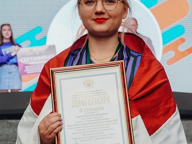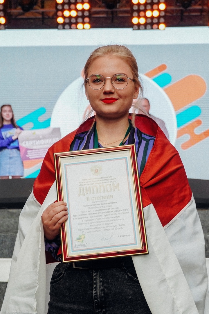 В грантовом направлении «Вовлечение студенческой молодежи в трудовую, общественно значимую, социально ориентированную деятельность» был отмечен проект Ксении Канаевой, студентки факультета иностранных языков. Ее проект «Стратегическая сессия: перспективы развития студенческих отрядов в ПФО» получил поддержку в размере 200 тысяч рублей.