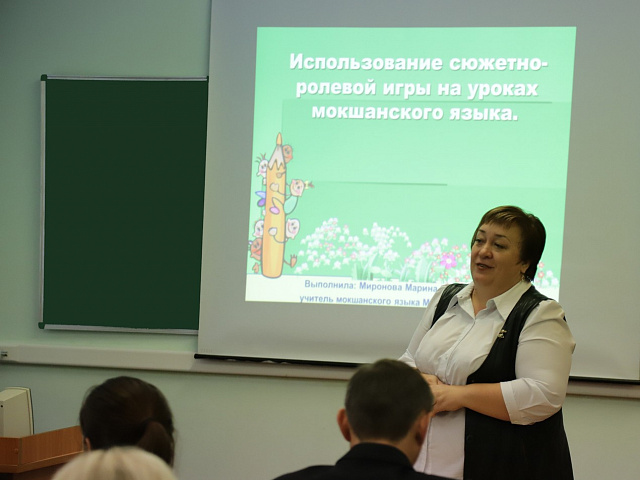 Возможности сюжетно-ролевой игры в процессе формирования коммуникативных навыков школьников и особенности организации игровой деятельности обучающихся в условиях ФГОС продемонстрировала Миронова М. Н., учитель мордовского языка МОУ «Средняя общеобразовательная школа с углубленным изучением отдельных предметов № 24» г. о. Саранск (мастер-класс «Сюжетно-ролевая игра на уроках мокшанского языка»).