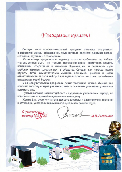 Поздравление ректора Мордовского государственного педагогического института имени М.Е. Евсевьева Марины Владимировны Антоновой с Днем учителя!