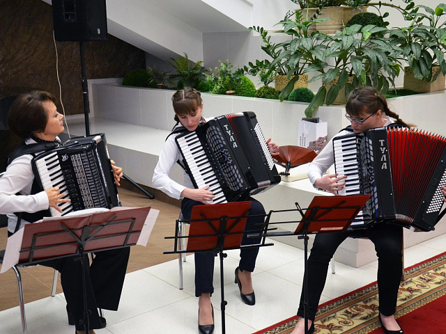 В фойе музея под звуки музыки собрались поклонники мира искусства. Инструментальный ансамбль «Гайгема», лауреат всероссийских и международных конкурсов, исполнил произведения российских и зарубежных композиторов.