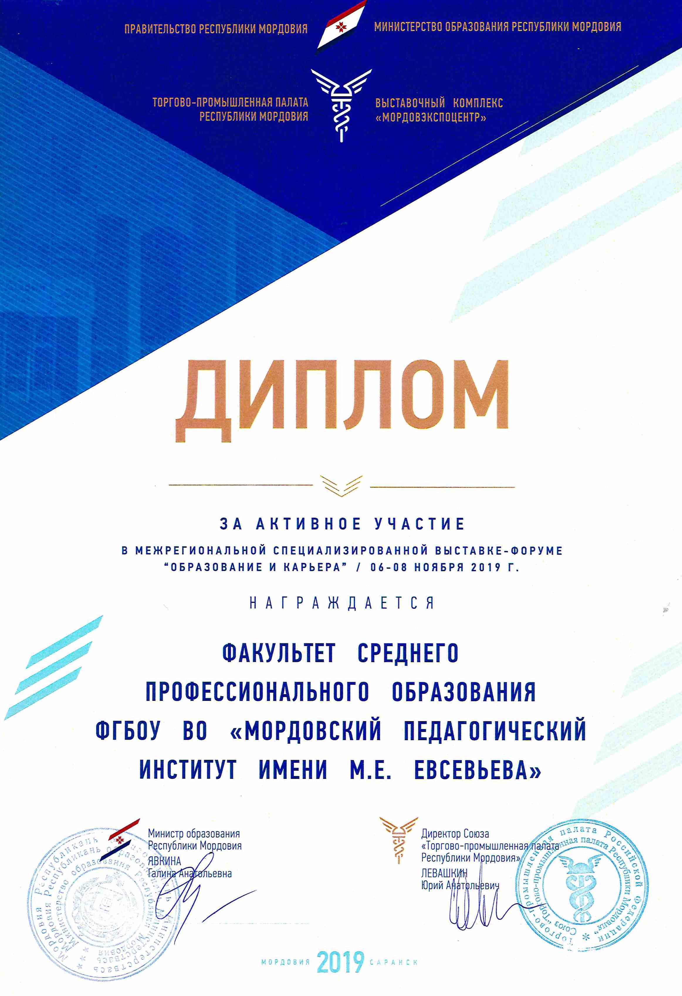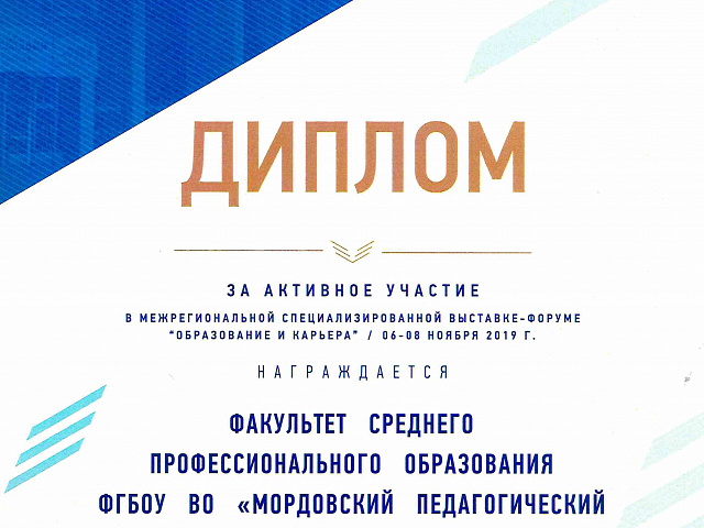 За активное участие в Межрегиональной специализированной выставке-форуме «Образование и карьера» (06-08 ноября 2019 г.) факультет среднего профессионального образования ФГБОУ ВО «Мордовский государственный педагогический институт имени М. Е. Евсевьева» был удостоен диплома.