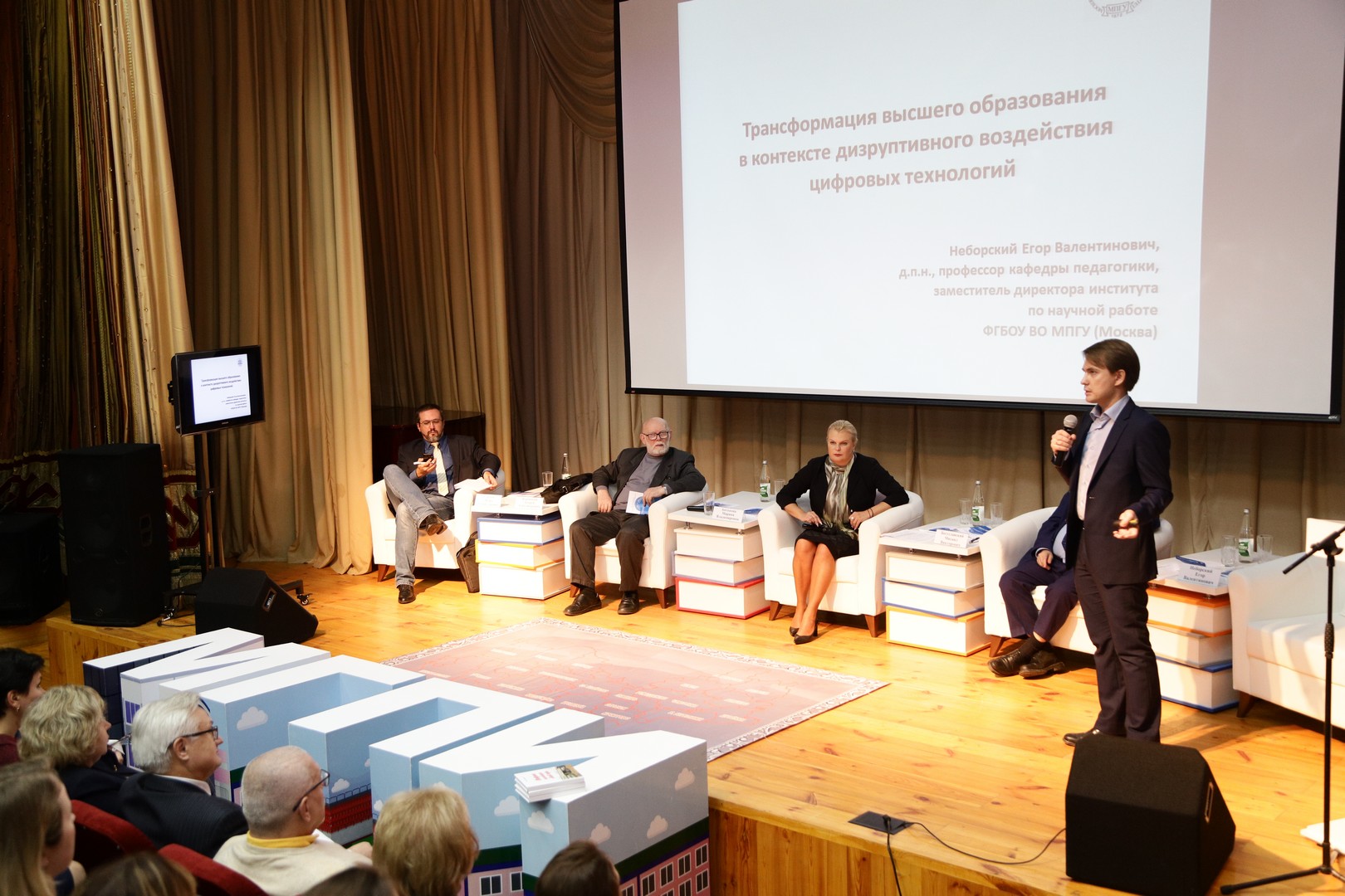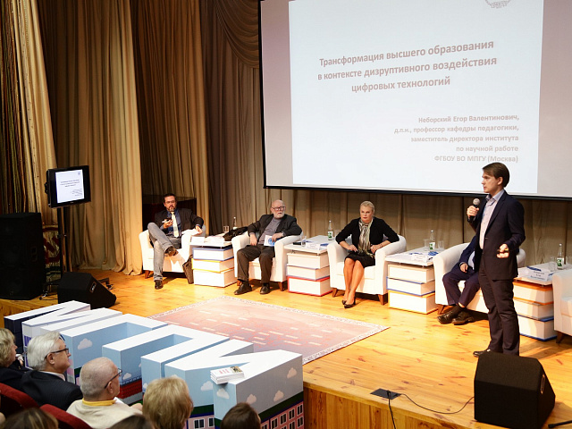 С вопросом о цифровой трансформации высшего образования в условиях широкого внедрения цифровых технологий выступил Егор Валентинович Неборский, доктор педагогических наук, заместитель директора по научной работе Института «Высшая школа образования» ФГБОУ ВО «Московский педагогический государственный университет». Он представил аудитории возможности открытых онлайн-платформ и дистанционного образования, подчеркнул важность развития научных сетевых сообществ.