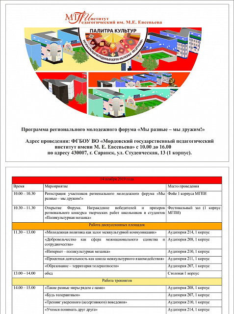 14 ноября 2019 года на площадке Мордовского государственного педагогического института имени М. Е. Евсевьева» при поддержке Федерального агентства по делам молодежи состоится региональный молодежный форум «Мы разные – мы дружим!» в рамках реализации проекта «Палитра культур».