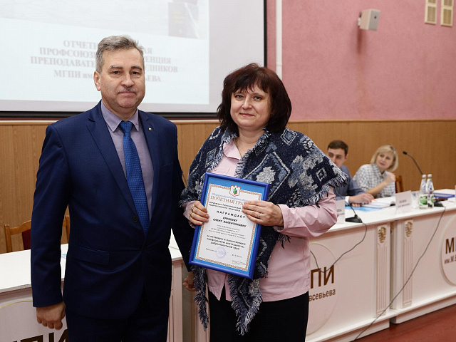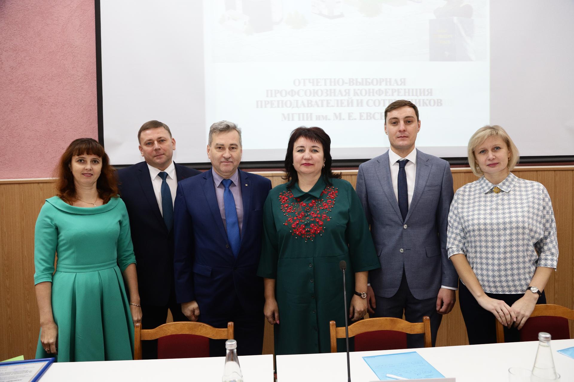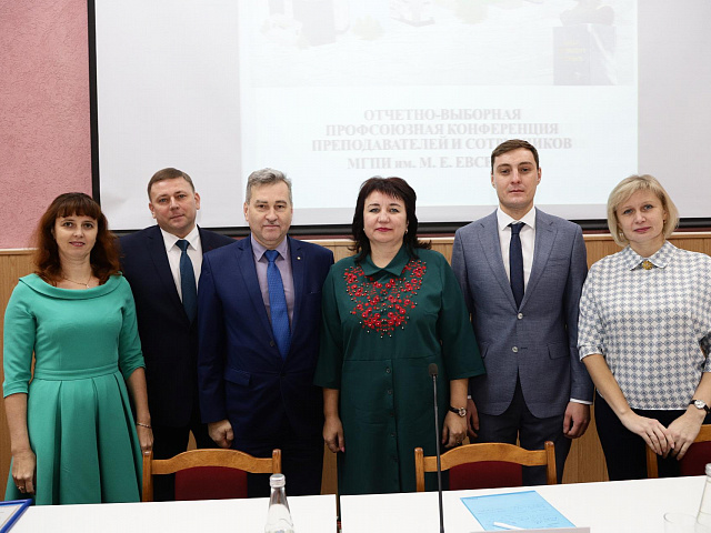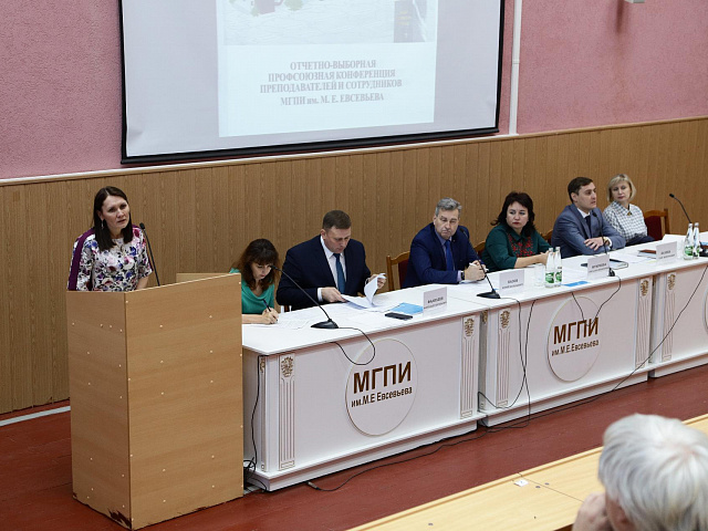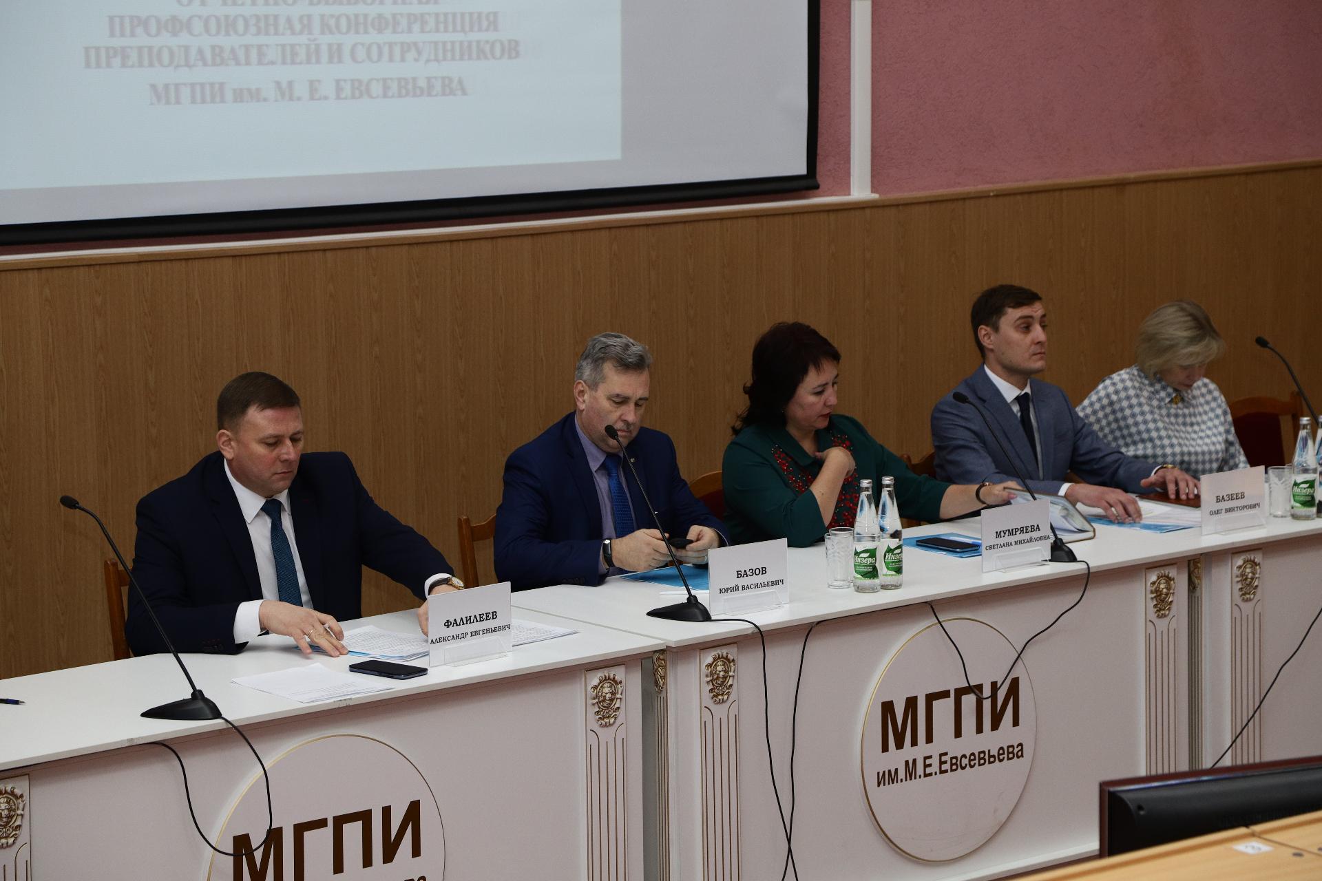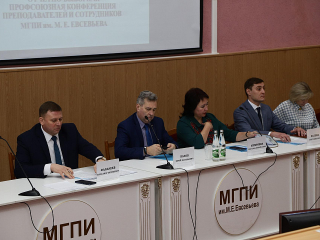 22 ноября 2019 года в Мордовском государственном педагогическом институте имени М. Е. Евсевьева состоялась отчетно-выборная профсоюзная конференция преподавателей и сотрудников. В состав президиума вошли: Базов Юрий Васильевич, председатель Мордовской республиканской организации Общероссийского Профсоюза образования; Мумряева Светлана Михайловна, проректор по учебной работе; Фалилеев Александр Евгеньевич, председатель первичной профсоюзной организации преподавателей и сотрудников МГПИ; Белоглазова Елена Владимировна, директор библиотеки; Базеев Олег Викторович, начальник редакционно-издательского центра.