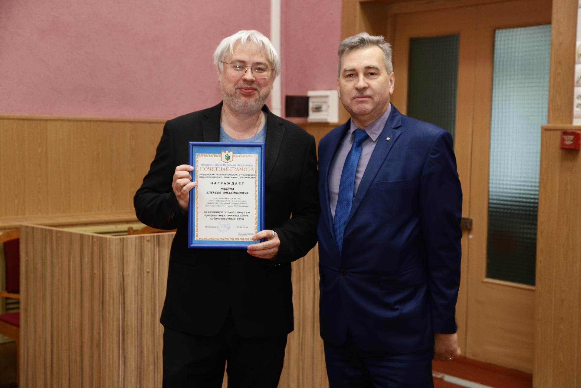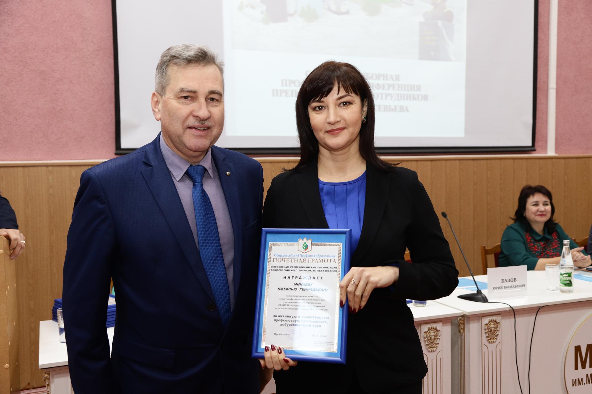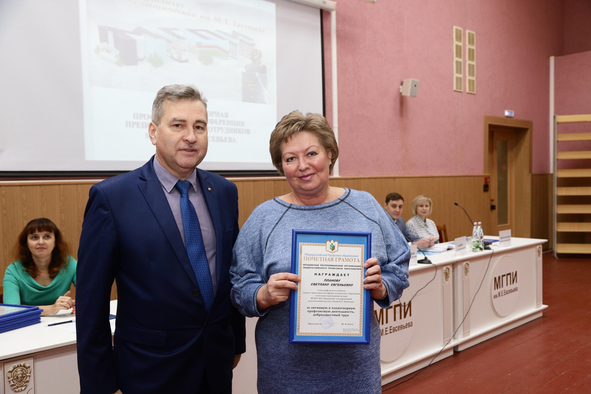 С приветственным словом к участникам конференции обратился Базов Юрий Васильевич, председатель Мордовской республиканской организации Общероссийского Профсоюза образования, который отметил большую роль профсоюзного комитета Мордовского государственного педагогического института имени М. Е. Евсевьева в развитии профсоюзного движения Республики Мордовия, поблагодарил за активную результативную работу действующего председателя первичной профсоюзной организации преподавателей и сотрудников Фалилеева Александра Евгеньевича и вручил Почетные грамоты Мордовской республиканской организации Общероссийского Профсоюза образования членам профсоюзного комитета, которые вели плодотворную профсоюзную деятельность.