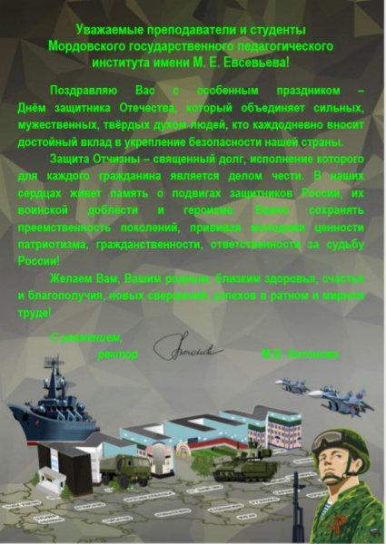 ПОЗДРАВЛЕНИЕ РЕКТОРА МОРДОВСКОГО ГОСУДАРСТВЕННОГО ПЕДАГОГИЧЕСКОГО ИНСТИТУТА ИМЕНИ М.Е. ЕВСЕВЬЕВА МАРИНЫ ВЛАДИМИРОВНЫ АНТОНОВОЙ С ДНЕМ ЗАЩИТНИКА ОТЕЧЕСТВА!
