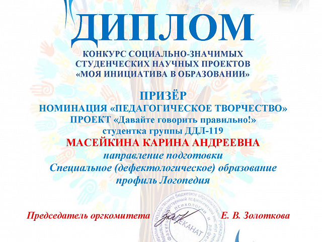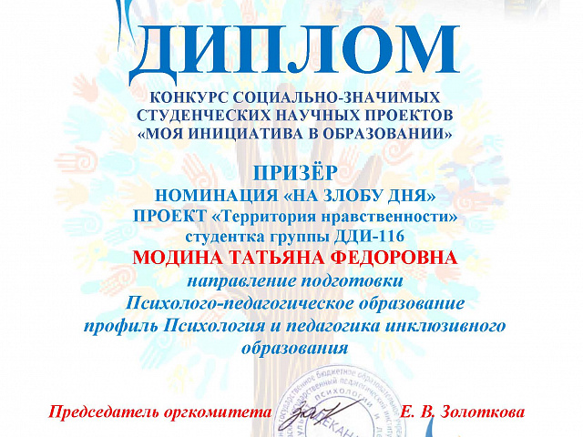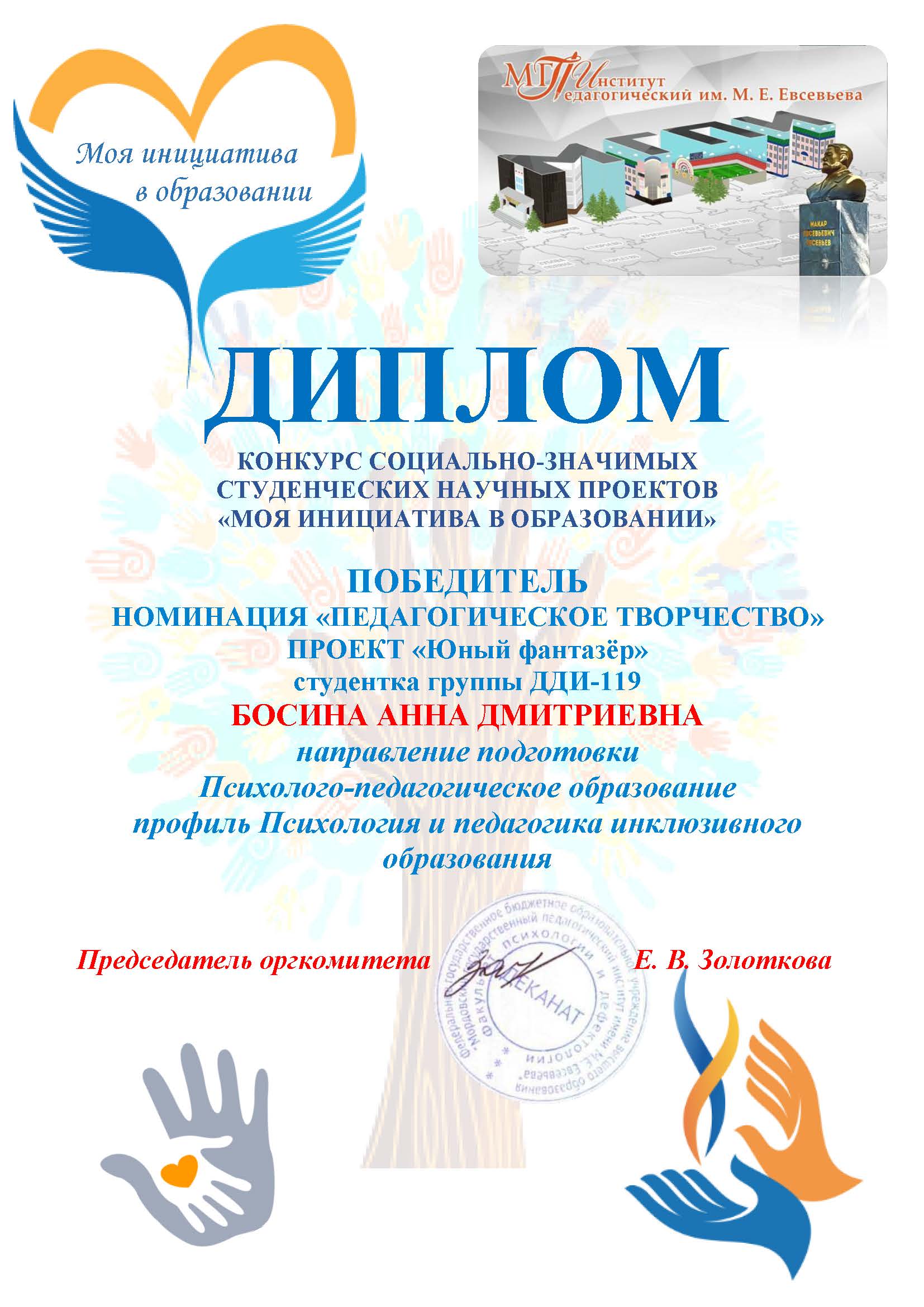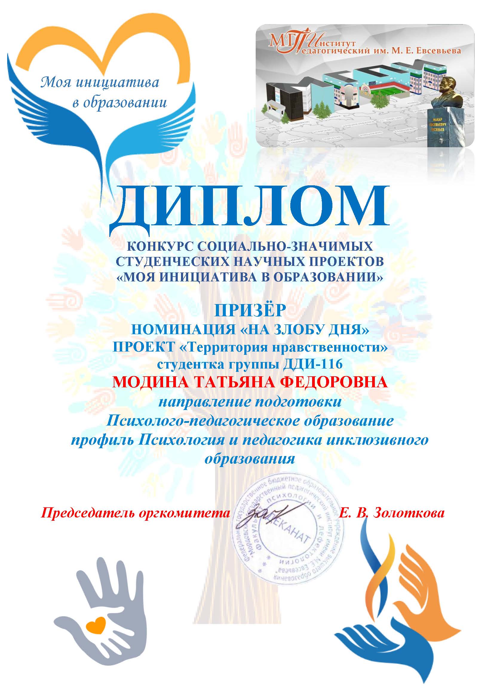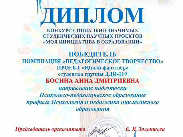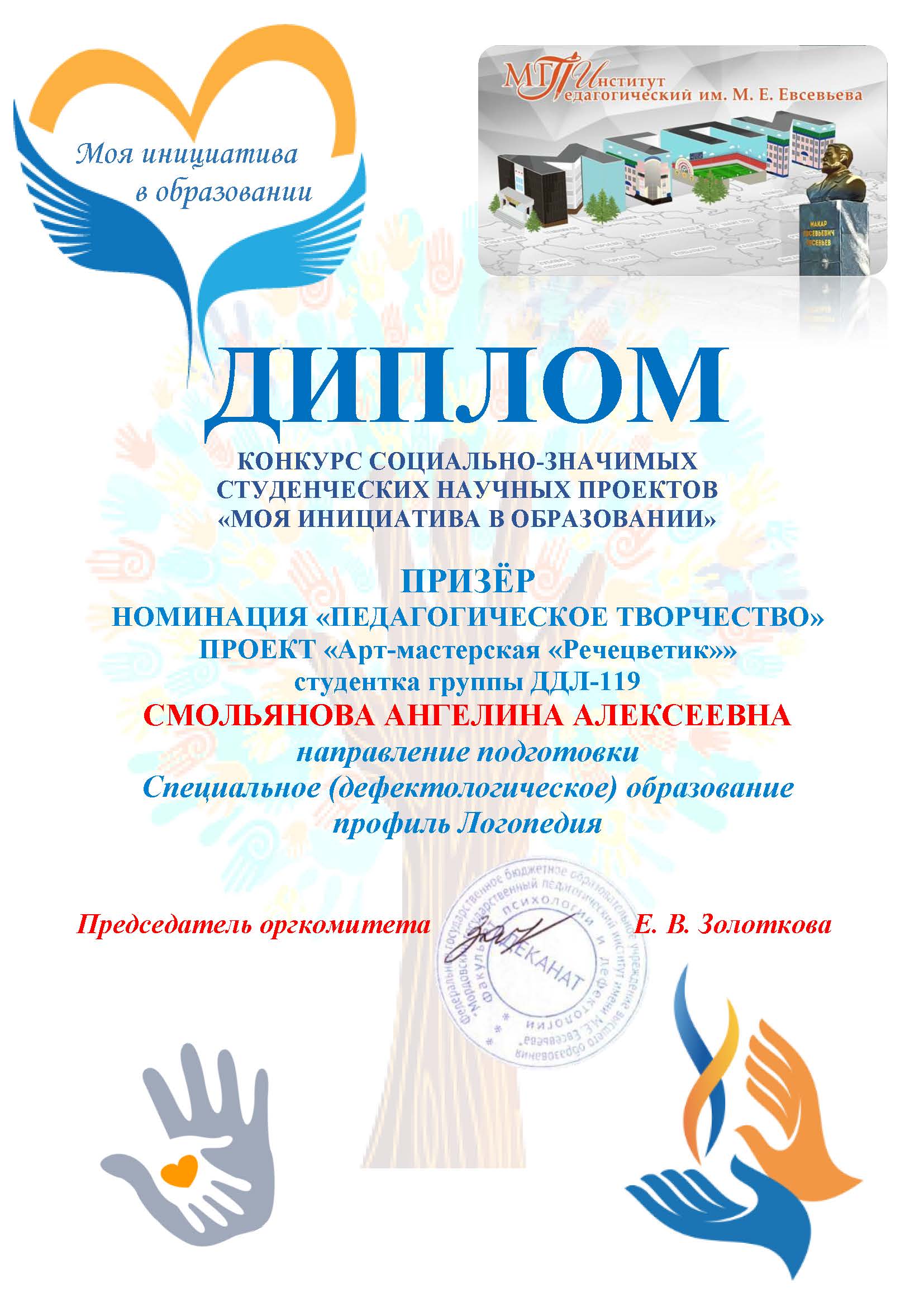 С 06.04.2020 по 21.04.2020 года в Мордовском государственном педагогическом институте имени М. Е. Евсевьева в дистанционном формате проходил конкурс социально-значимых научных проектов «Моя инициатива в образовании». В конкурсе приняли участие учащиеся 1-4 курсов, а также магистранты факультета психологии и дефектологии.