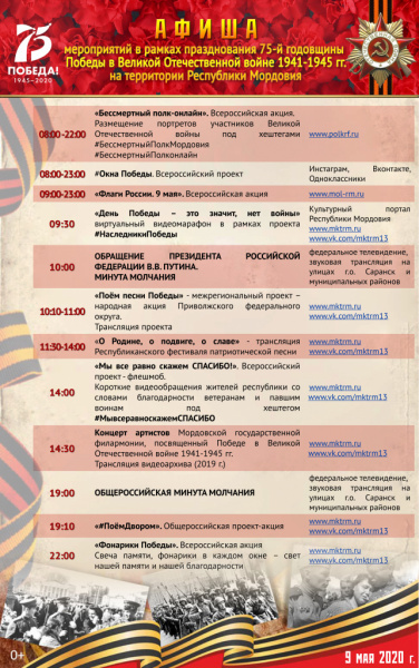 АФИША МЕРОПРИЯТИЙ В РАМКАХ ПРАЗДНОВАНИЯ 75-Й ГОДОВЩИНЫ ПОБЕДЫ В ВЕЛИКОЙ ОТЕЧЕСТВЕННОЙ ВОЙНЕ 1941-1945 ГГ. НА ТЕРРИТОРИИ РЕСПУБЛИКИ МОРДОВИЯ