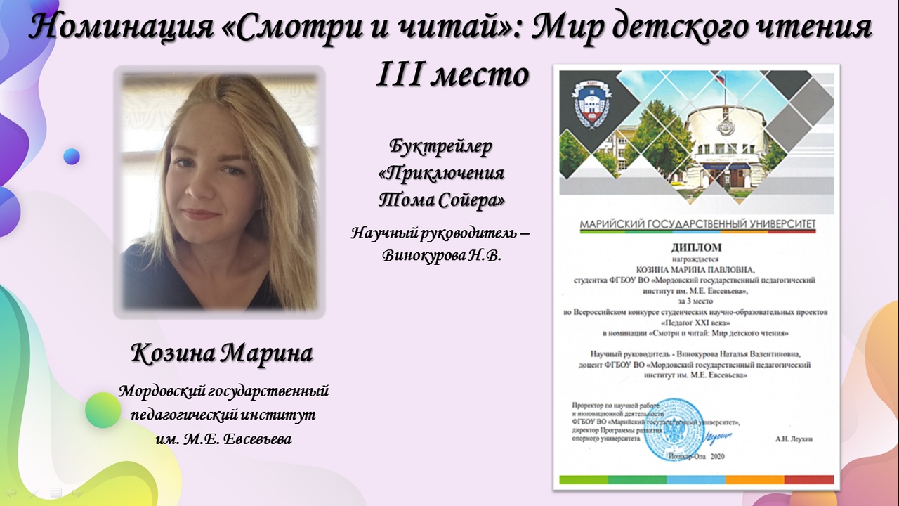 22 мая состоялось подведение итогов Конкурса в формате видеоконференции. Проект буктрейлера детской книги студентки 3 курса факультета педагогического и художественного образования Марины Козиной занял 3 место в номинации «Смотри и читай» (руководитель Н. В. Винокурова).
