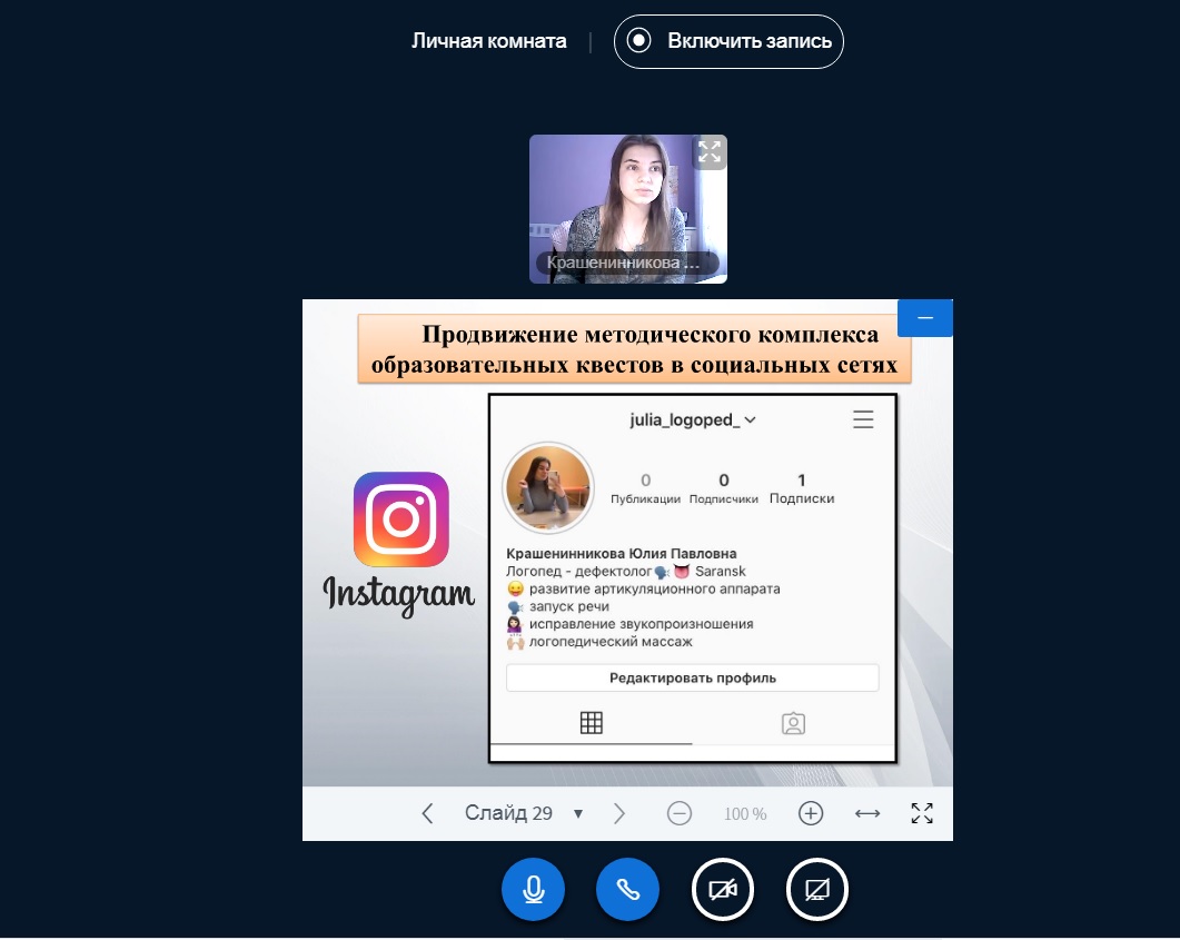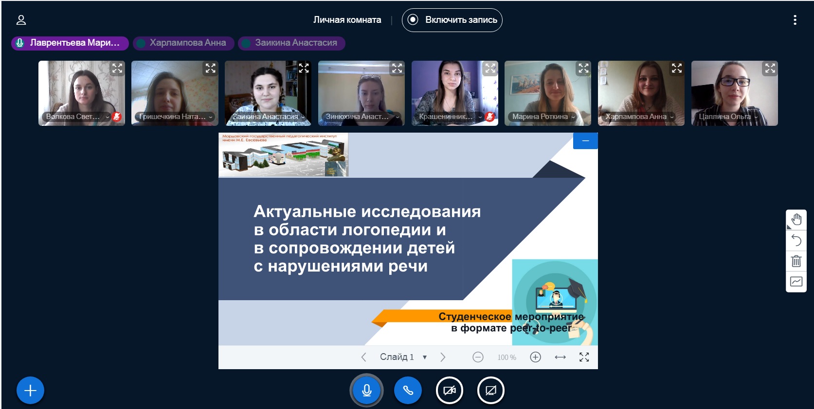 В МГПИ имени М. Е. Евсевьева особое значение придается внедрению инновационных образовательных технологий. 26 мая 2020 года в формате новой парадигмы учебно-исследовательской деятельности обучающихся по принципу «равный – равному», базирующейся на идее массового сотрудничества, идеологии открытых образовательных ресурсов, в сочетании с сетевой организацией взаимодействия участников, студенты факультета психологии и дефектологии делились практическими результатами проектно-исследовательской деятельности в сфере логопедии. В процессе диалога участников мероприятия, раскрывавших освоенные знания и приобретенные компетенции, вырабатывались результативная стратегия и действенная тактика создания востребованного практической логопедией методического продукта.