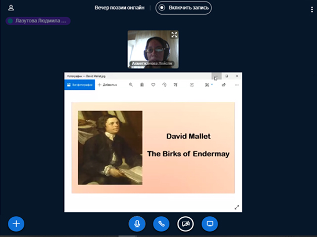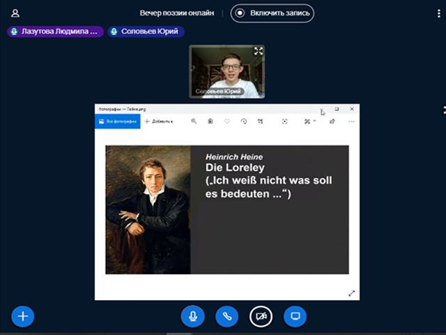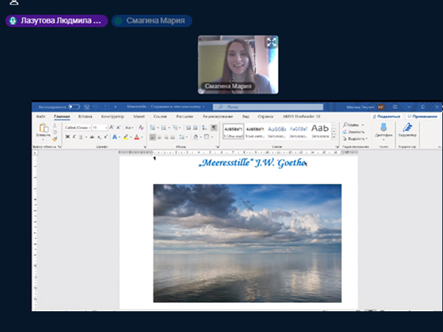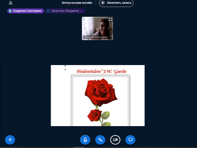 В дистанционном формате на платформе Big Blue Button прозвучали стихи зарубежных поэтов на английском и немецком языках. Будущие учителя иностранных языков продемонстрировали высокий уровень знания в области зарубежной поэзии разных эпох: от классики до современности. Многие студенты выбрали лиричные произведения великих немецких классиков Г. Гейне и И. В. фон Гете: Соловьев Юрий, студент 3 курса, прочитал стихотворение «Lorelei»; студентка 2 курса Бодрова Екатерина представила стихотворение «Heidenrößlein». Не осталось без внимания творчество великого английского классика. В исполнении студентки 3 курса Дудниковой Ирины и студентки 2 курса Смагиной Марии прозвучали знаменитые сонеты У. Шекспира.