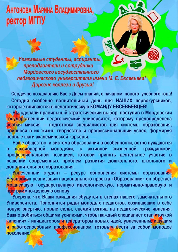 ПОЗДРАВЛЕНИЕ РЕКТОРА МОРДОВСКОГО ГОСУДАРСТВЕННОГО ПЕДАГОГИЧЕСКОГО УНИВЕРСИТЕТА ИМЕНИ М.Е. ЕВСЕВЬЕВА МАРИНЫ ВЛАДИМИРОВНЫ АНТОНОВОЙ С ДНЕМ ЗНАНИЙ