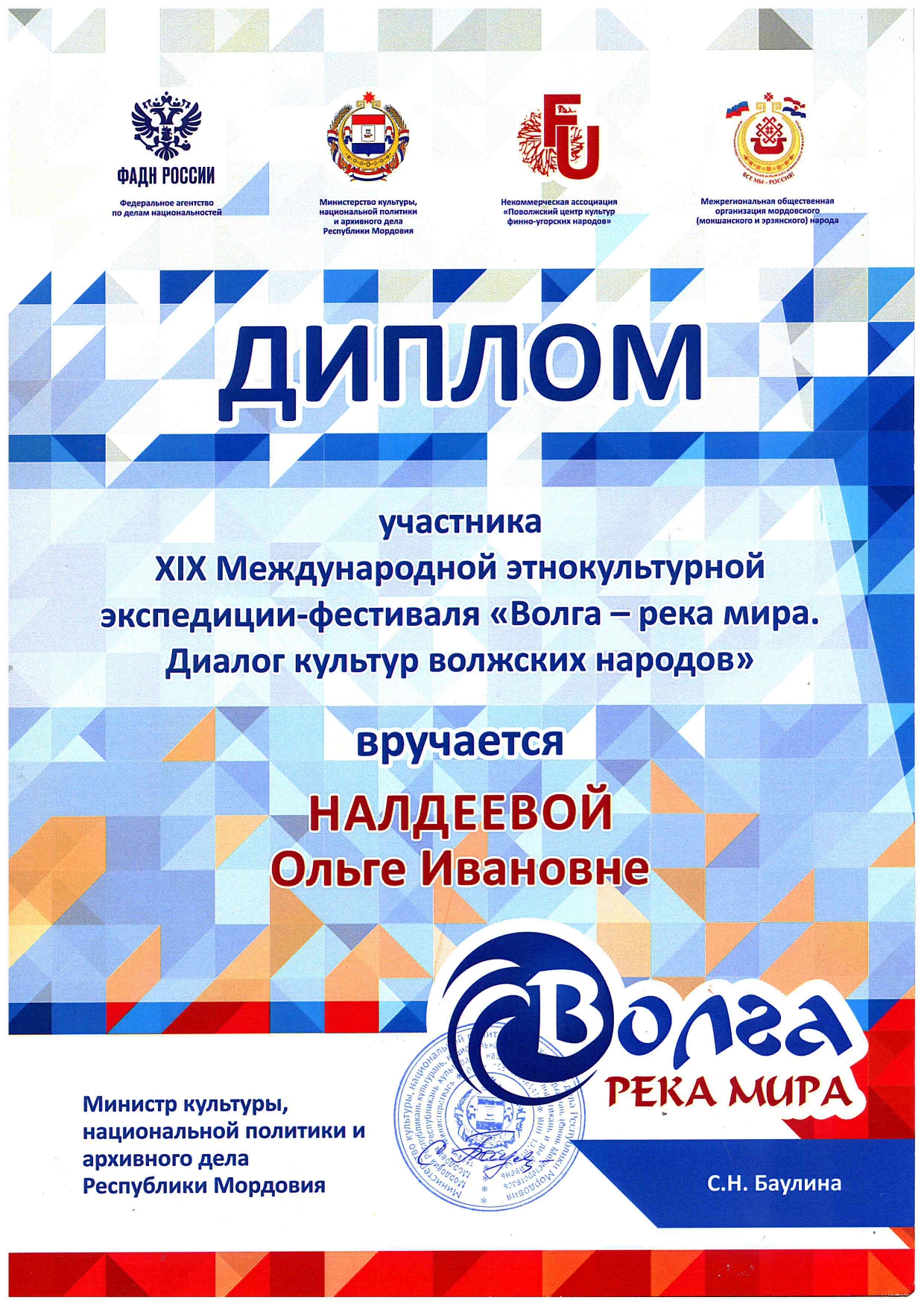 С 7 по 12 сентября 2020 года проходила ежегодная XIX Международная экспедиция «Волга – река мира. Диалог культур волжских народов». В работе фестиваля приняли участие представители Федерального агентства по делам национальностей, работники культуры, ученые вузов, руководители НКО и языковых центров многих регионов России. В рамках программы экспедиции были проведены конференции, семинары, конкурсы, круглые столы, концерты и выставки, ориентированные на дальнейшее сохранение национальных традиций и обрядов. Выступая на презентации программы этого форума, заместитель руководителя Федерального агентства по делам национальностей Станислав Бедкин акцентировал внимание на активном привлечении молодежи в реализации этнокультурных проектов.