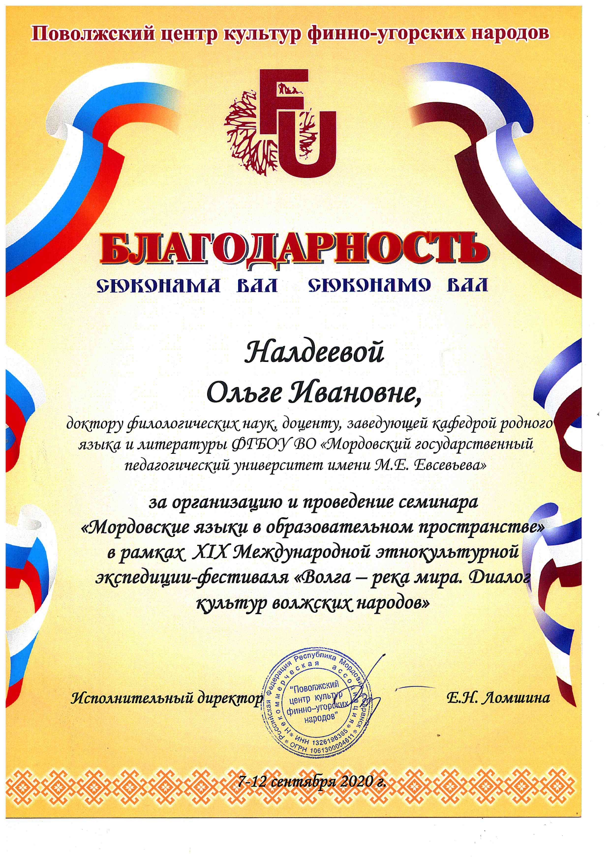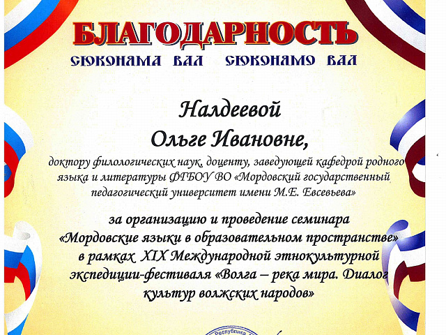 Активное участие в работе XIX Международной экспедиции принял Мордовский государственный педагогический университет имени М. Е. Евсевьева в лице Ольги Ивановны Налдеевой, руководителя Научно-образовательного центра продвижения родного языка и литературы, заведующего кафедрой родного языка и литературы. Являясь модератором семинара «Мордовские языки в образовательном пространстве», она представила информацию об изучении родного языка и литературы в контексте непрерывного педагогического образования Республики Мордовия, продемонстрировала систему работы Мордовского государственного педагогического университета имени М. Е. Евсевьева по сохранению и продвижению родных языков и литератур. Живой интерес у участников мероприятия вызвала ON-LINE «ШКОЛА МОРДОВСКИХ ЯЗЫКОВ». Руководители мордовских национально-культурных автономий многих областей и республик выразили огромную благодарность руководству вуза за неоценимый вклад в развитие мордовских (мокшанского, эрзянского) языков и культуры.