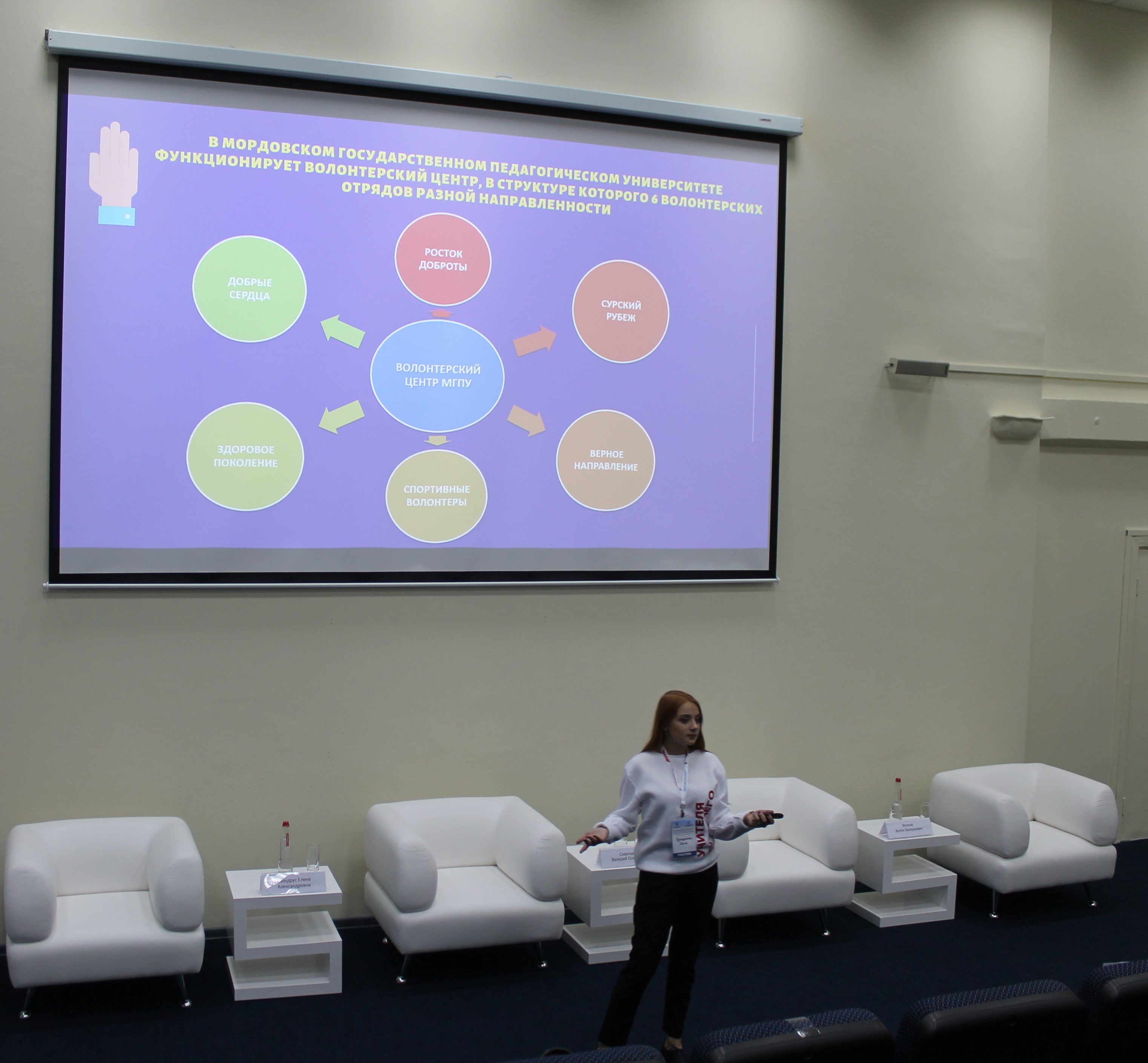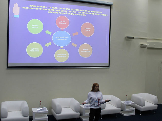 В рамках проектной сессии «Успешные практики волонтерской работы» лидеры студенческих объединений поделились своими инициативами, реализованными в период пандемии коронавируса. Кудашкина Ольга рассказала о деятельности Волонтеров Победы МГПУ, которые в течение 4 месяцев работали в штабе по оказанию помощи гражданам региона во время самоизоляции, а также проектах и практиках, реализованных в вузе с использованием цифровых технологий (проект «Сказки на ночь», «Онлайн-лагерь «Каникулы в МГПУ»», «Школа мордовских языков» и др.).