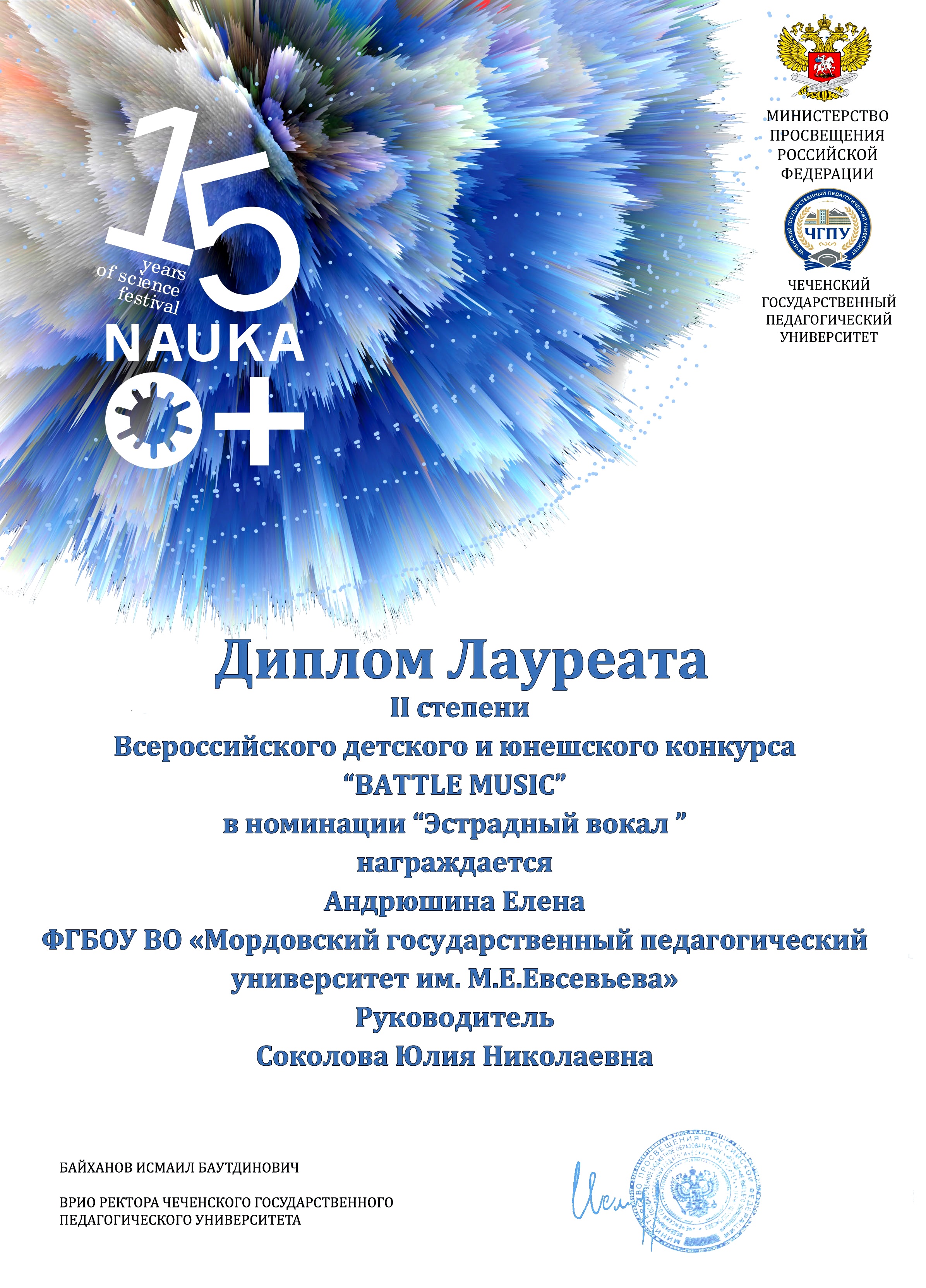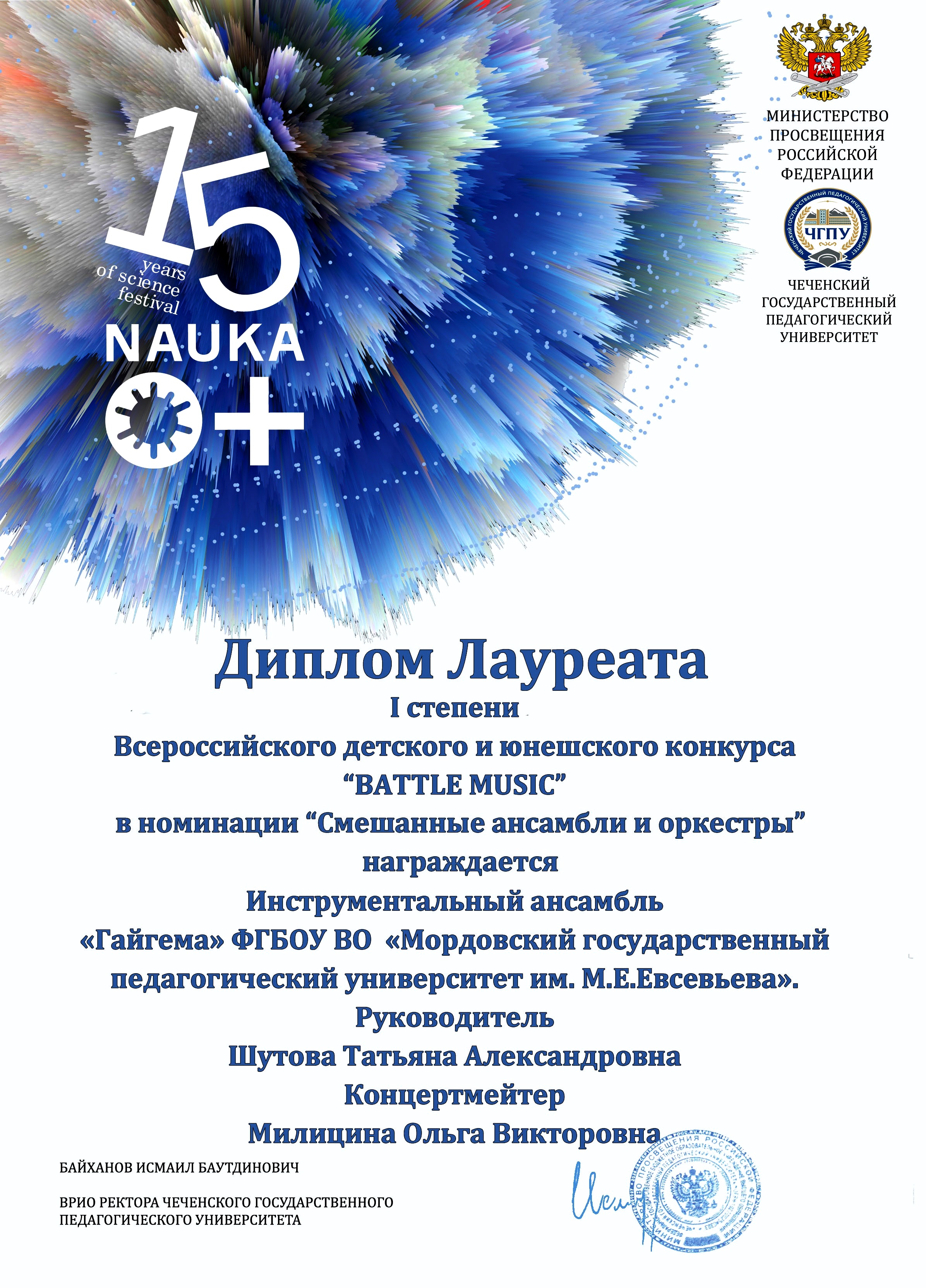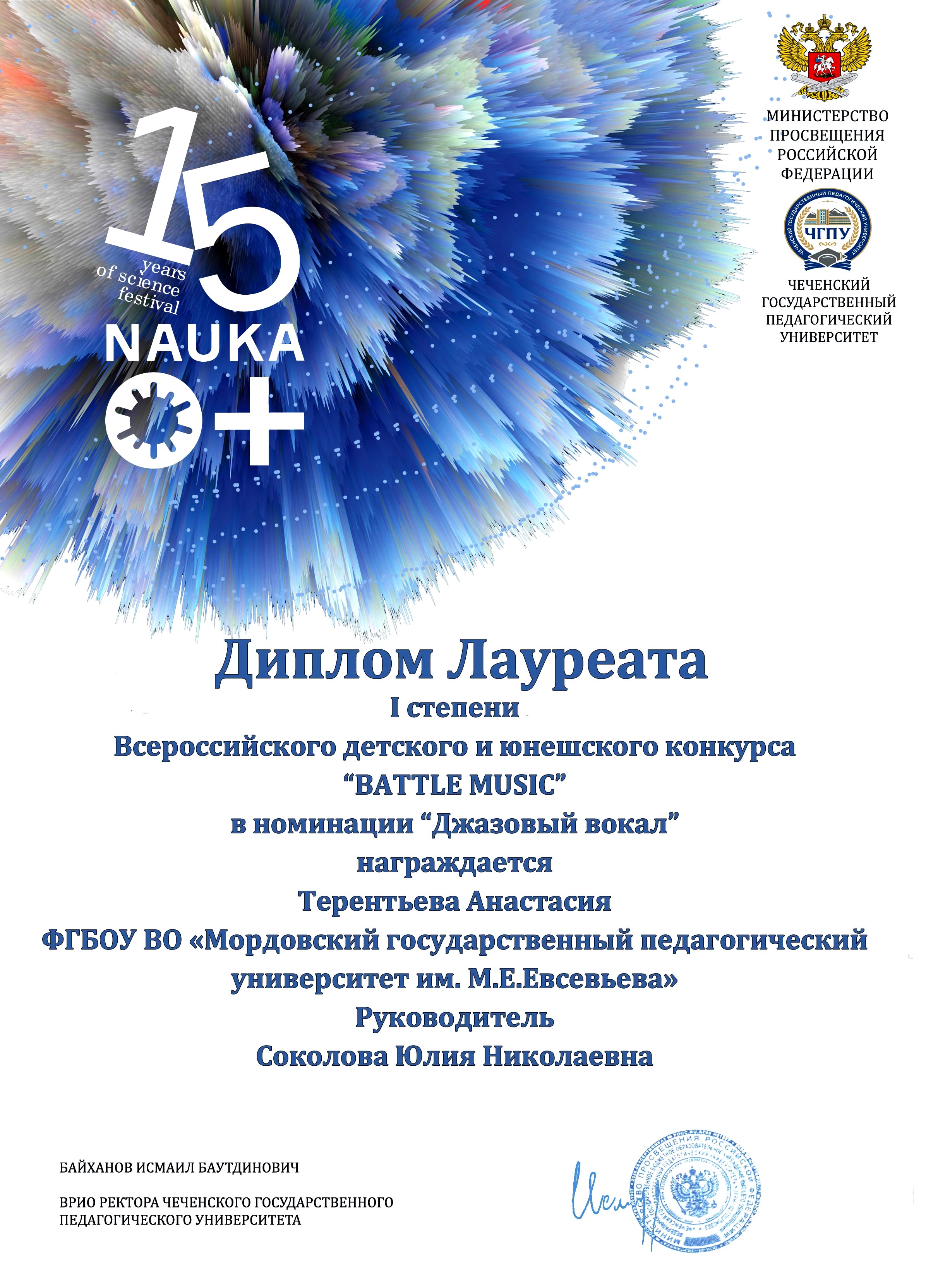 СТУДЕНТЫ ФАКУЛЬТЕТА ПЕДАГОГИЧЕСКОГО И ХУДОЖЕСТВЕННОГО ОБРАЗОВАНИЯ МГПУ ИМ. М. Е. ЕВСЕВЬЕВА СТАЛИ ЛАУРЕАТАМИ ВСЕРОССИЙСКОГО КОНКУРСА ДЕТСКОГО И ЮНОШЕСКОГО ТВОРЧЕСТВА «BATTLE MUSIC», КОТОРЫЙ ПРОШЕЛ НА БАЗЕ ФАКУЛЬТЕТА ИСКУССТВ В ЧЕЧЕНСКОМ ГОСУДАРСТВЕННОМ ПЕДАГОГИЧЕСКОМ УНИВЕРСИТЕТЕ.