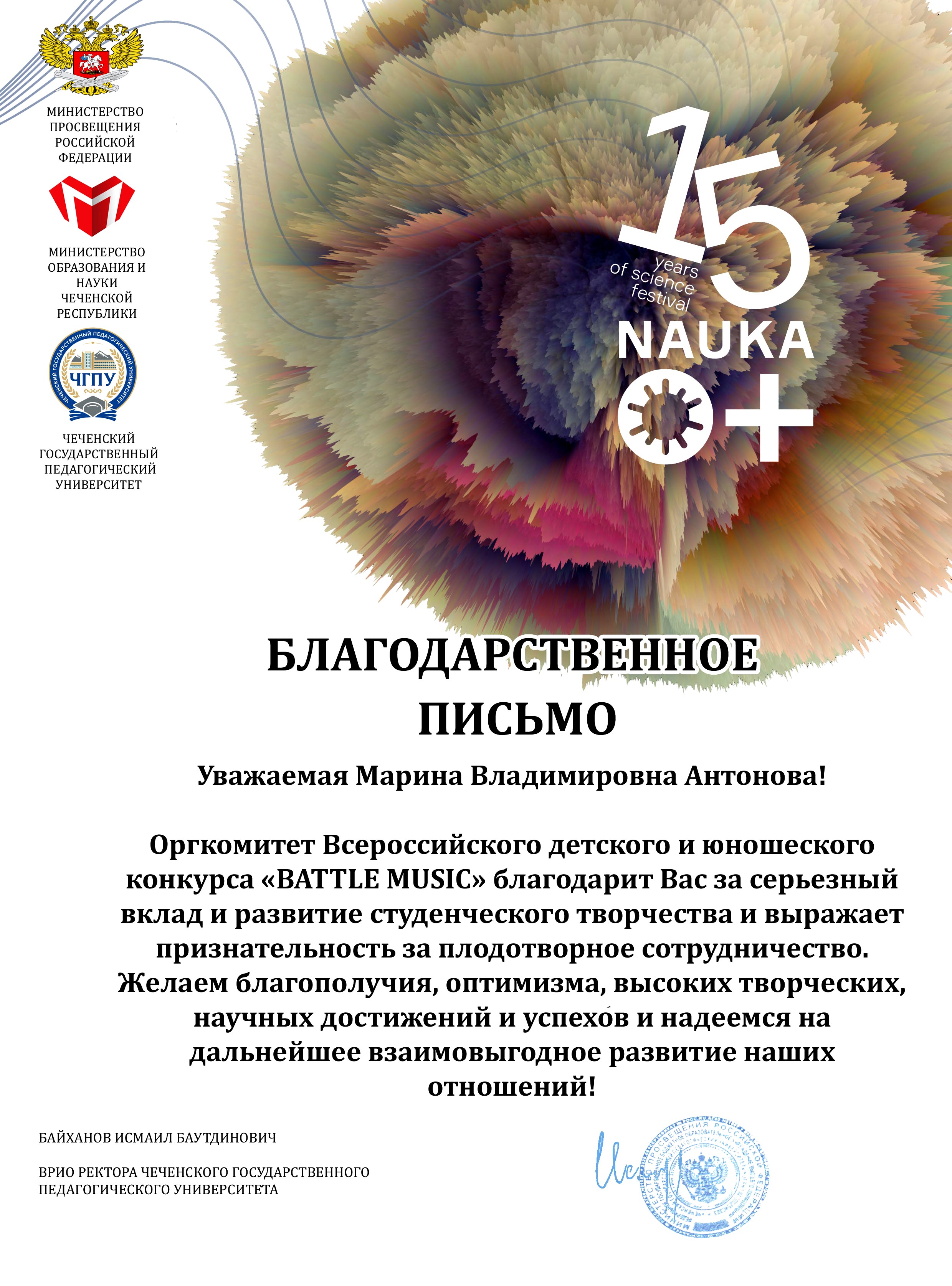 УЧАСТИЕ В КОНКУРСЕ СТАЛО НАЧАЛОМ ОСУЩЕСТВЛЕНИЯ ПЛОДОТВОРНОГО ТВОРЧЕСКОГО СОТРУДНИЧЕСТВА НАШЕГО ВУЗА И ЧЕЧЕНСКОГО ГОСУДАРСТВЕННОГО ПЕДАГОГИЧЕСКОГО УНИВЕРСИТЕТА.