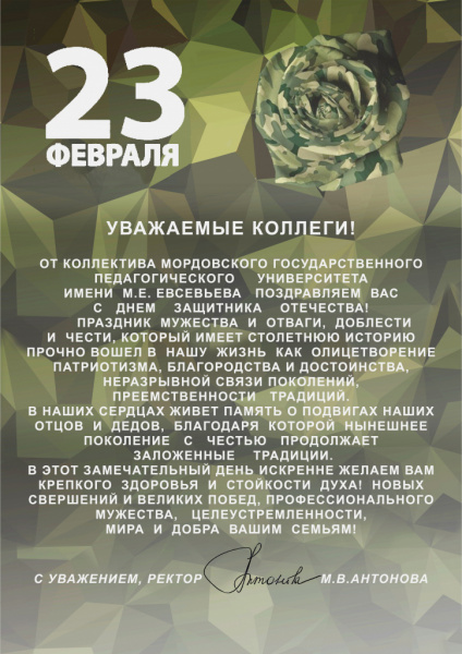 ПОЗДРАВЛЕНИЕ РЕКТОРА МОРДОВСКОГО ГОСУДАРСТВЕННОГО ПЕДАГОГИЧЕСКОГО университета ИМЕНИ М.Е. ЕВСЕВЬЕВА МАРИНЫ ВЛАДИМИРОВНЫ АНТОНОВОЙ С ДНЕМ ЗАЩИТНИКА ОТЕЧЕСТВА!