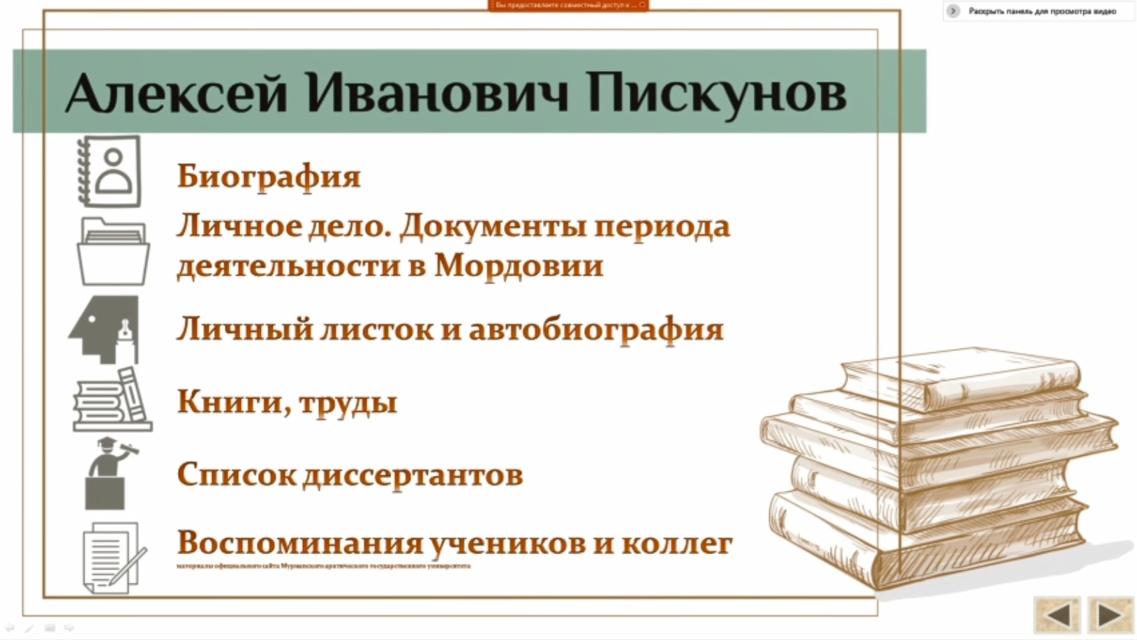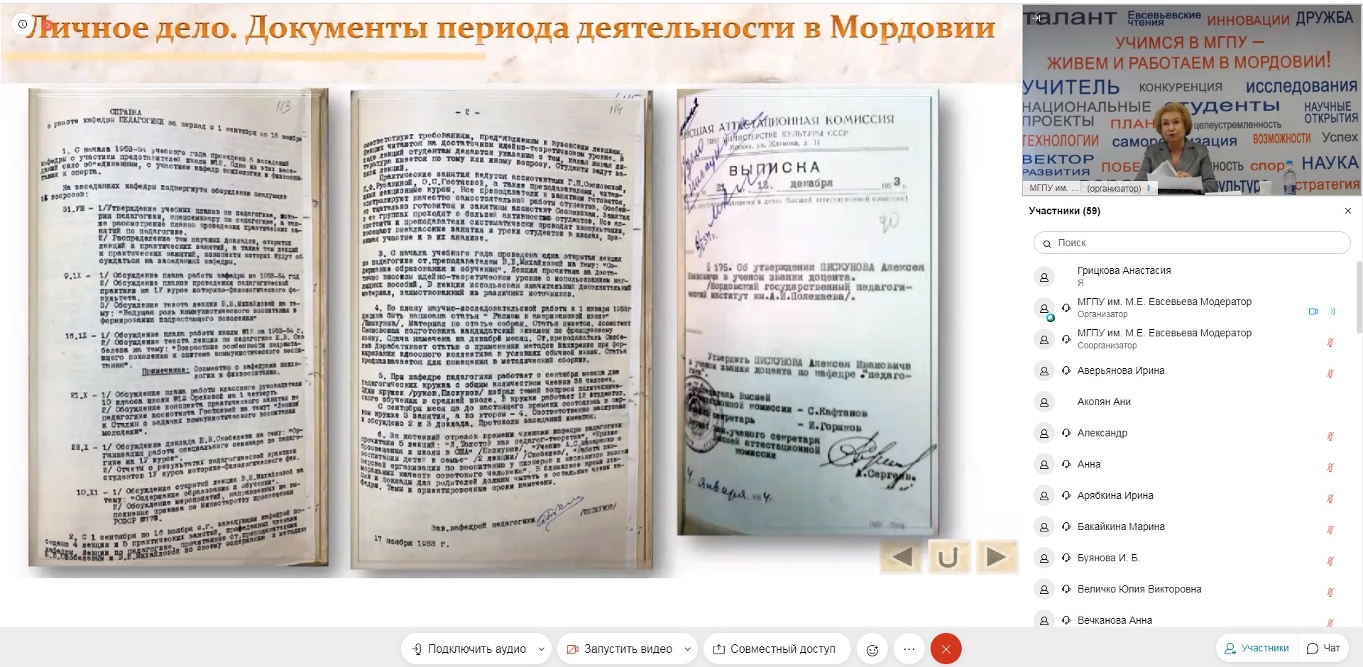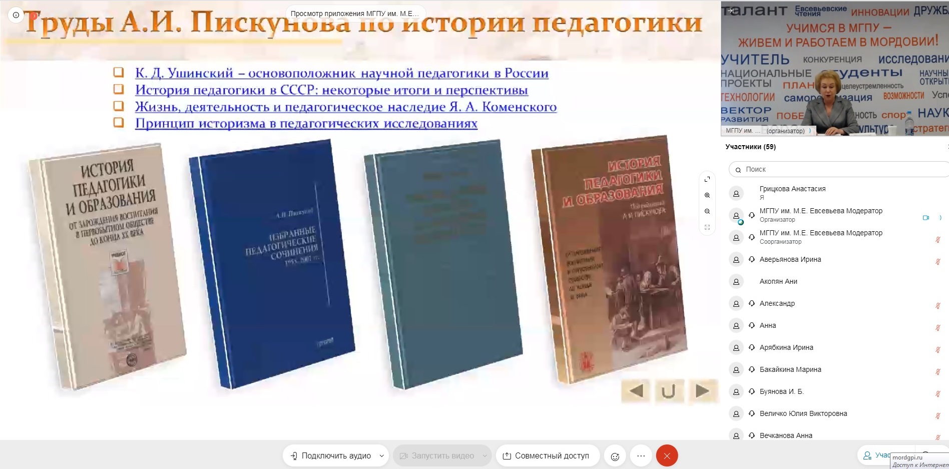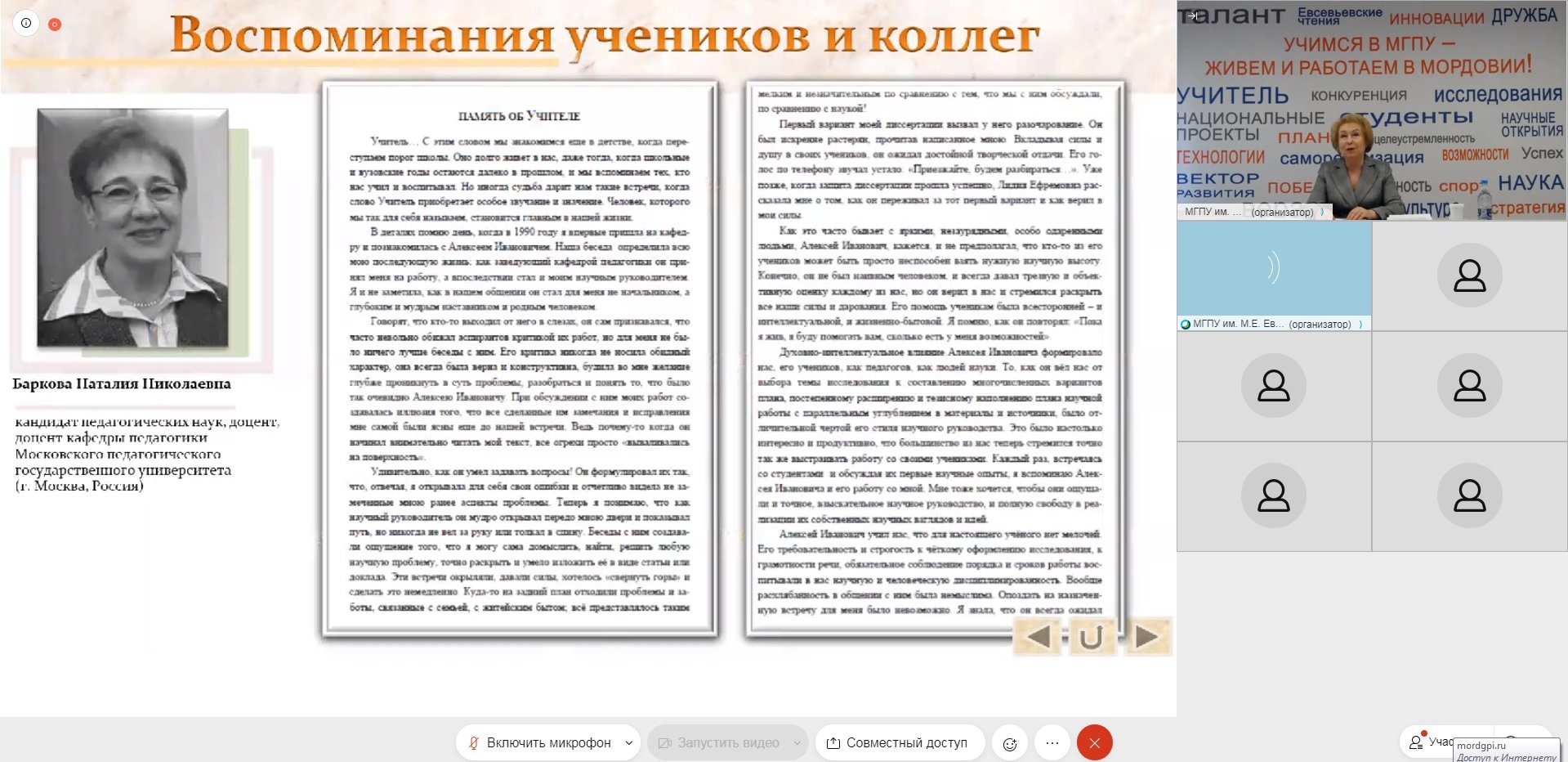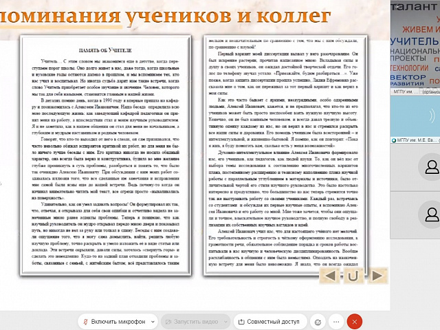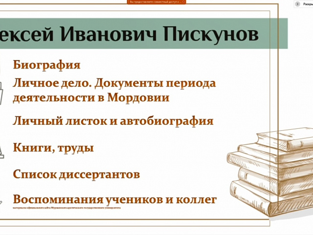 Открыла онлайн-выставку проректор по научной работе Татьяна Ивановна Шукшина. Выступая с приветственным словом к участникам онлайн-выставки от имени оргкомитета, педагогического коллектива Мордовского государственного педагогического университета имени М. Е. Евсевьева, Татьяна Ивановна подчеркнула: «Именно сегодня, 24 февраля, исполняется 100 лет со дня рождения действительного члена Российской академии образования, доктора педагогических наук, профессора Алексея Ивановича Пискунова. Для нас весьма важно, что жизнь этого выдающего человека связана с нашей республикой, так как два с половиной года Алексей Иванович работал в Саранске, в Мордовском государственном педагогическом институте имени А. И. Полежаева».