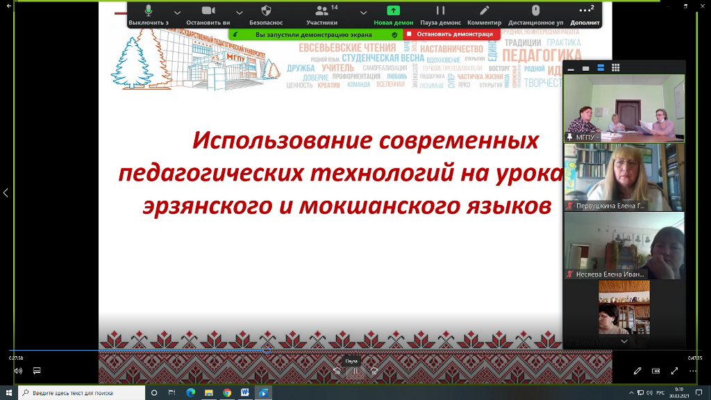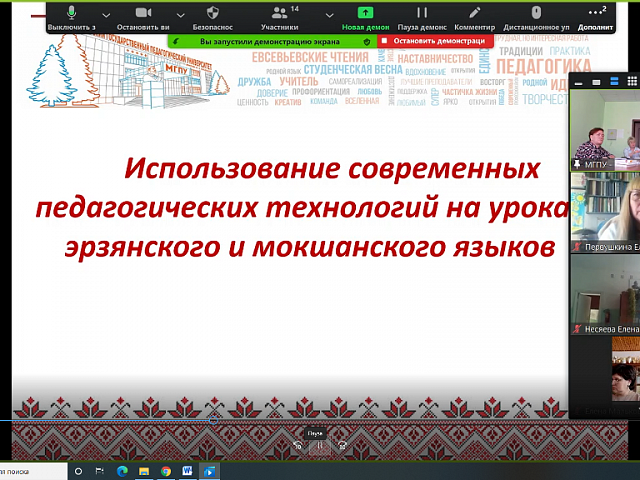 29 марта на площадке филологического факультета Мордовского государственного педагогического университета имени М. Е. Евсевьева состоялось онлайн-мероприятие «Педагогический калейдоскоп». Организаторами мероприятия выступили Научно-образовательный центр продвижения родного языка и литературы и Региональная мордовская национально-культурная автономия Пензенской области.
