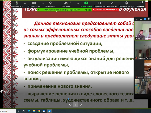 Савостькина М. И., кандидат филологических наук, доцент кафедры родного языка и литературы в докладе-презентации представила возможности использования современных педагогических технологий на уроках эрзянского и мокшанского языков. Азыркина Е. И., кандидат филологических наук, доцент кафедры родного языка и литературы провела дискурс-анализ учебно-методического оснащения предмета «Родная литература» в современной школе. Данильчев А. А., кандидат филологических наук, учитель мордовского языка МОУ «Лицей № 26», победитель конкурса «Лучший учитель мордовского (мокшанского, эрзянского) языка городского округа Саранск – 2021» представил доклад- рассуждение «Современный урок мордовского языка. Какой он?». Учителя родного языка Пензенской области (Несяева Е. И., Капранова Н. С., Понятова Л. Н.) поделились авторскими методиками, технологиями формирования интереса учащихся к изучению мордовских языков.