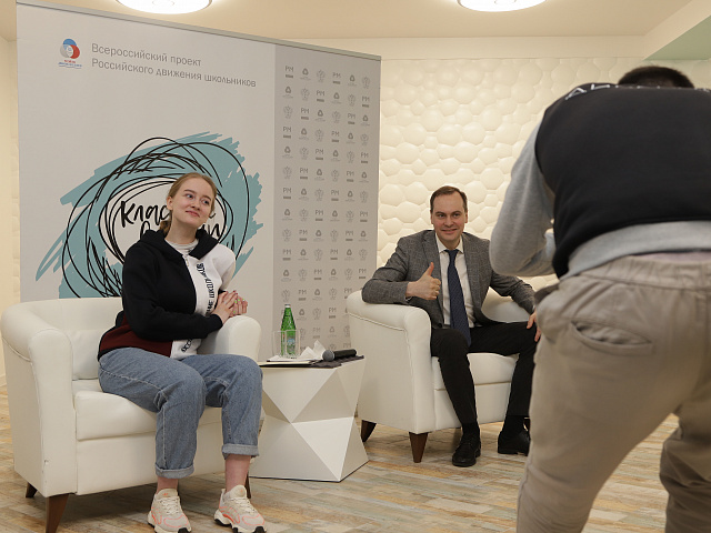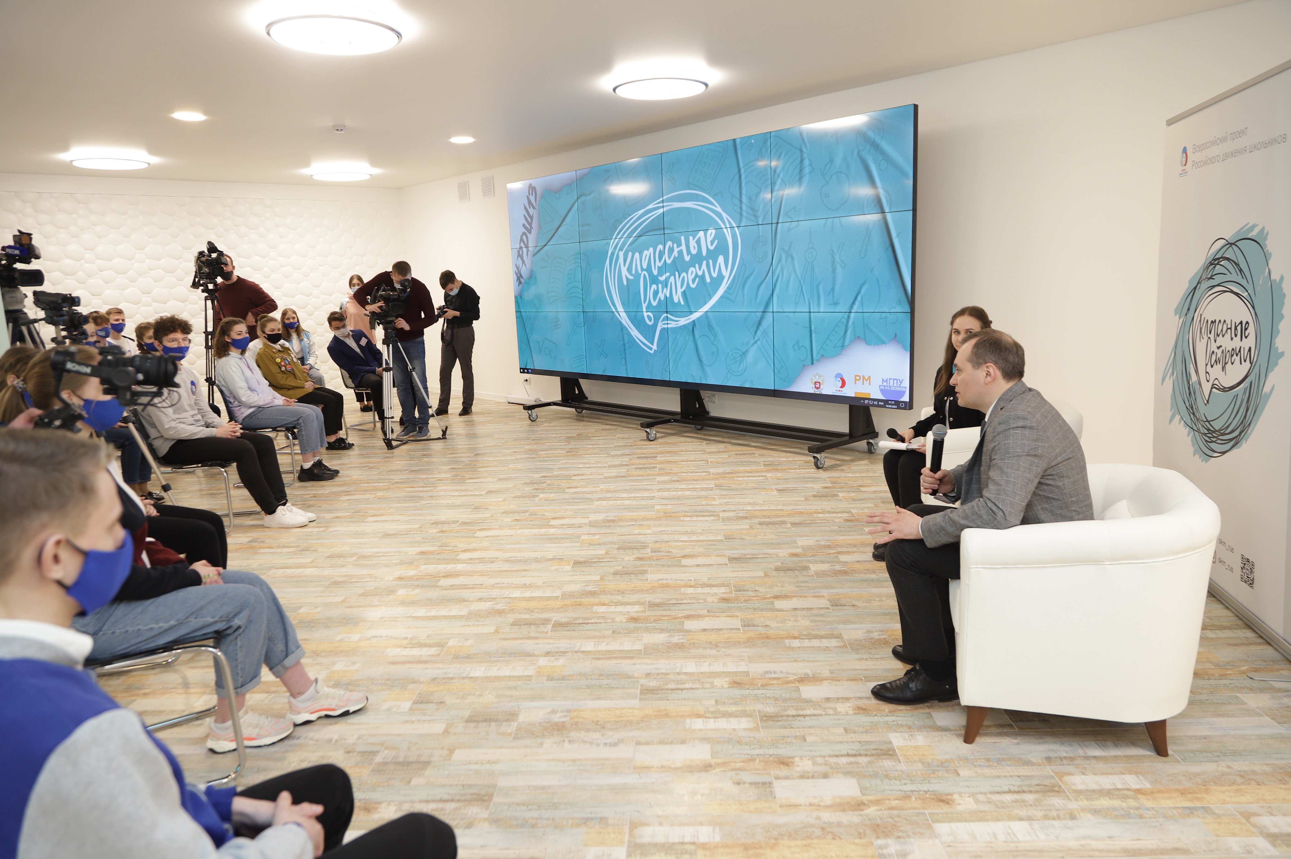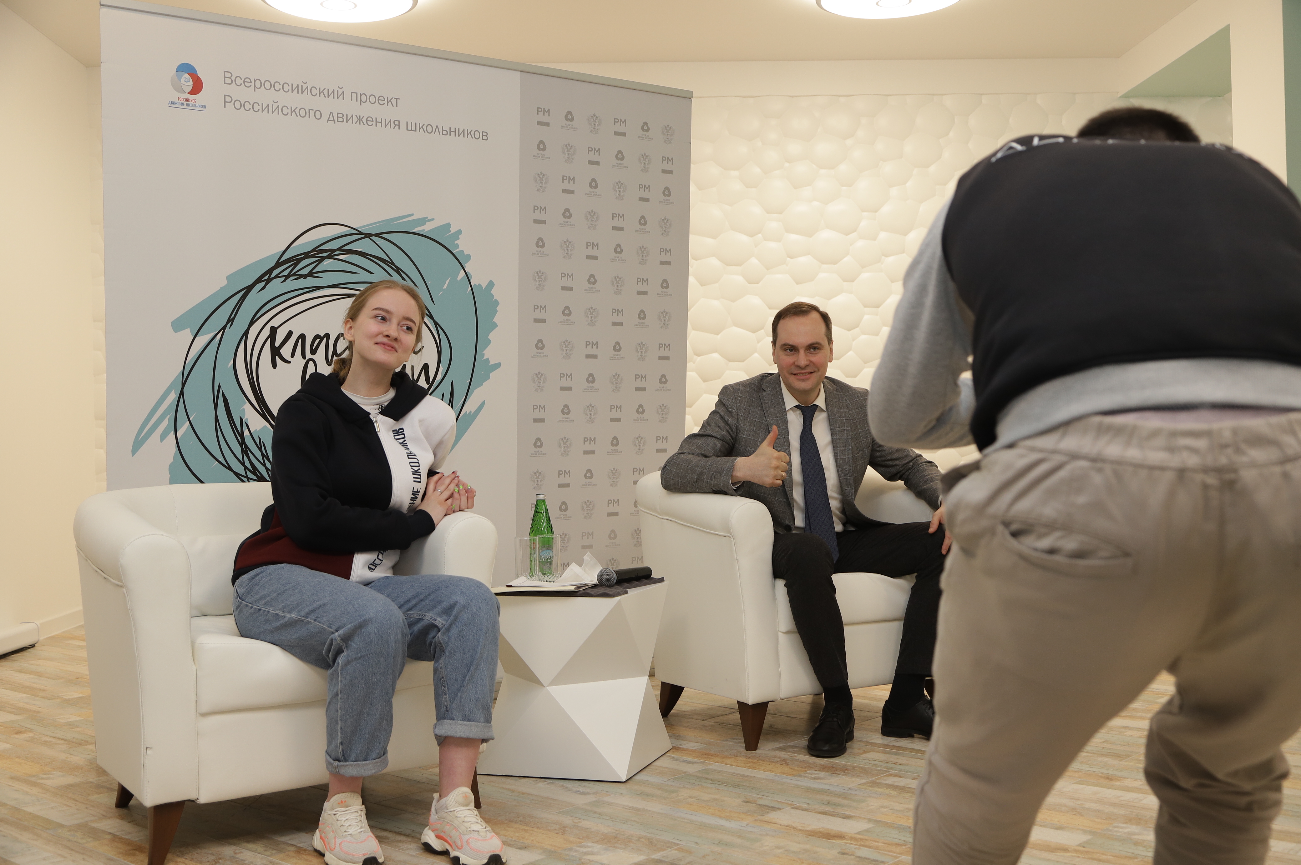 После коллективной фотосессии Артем Алексеевич принял участие в «классной встрече» с активистами Российского движения школьников и их наставниками вожатыми.