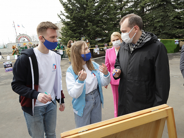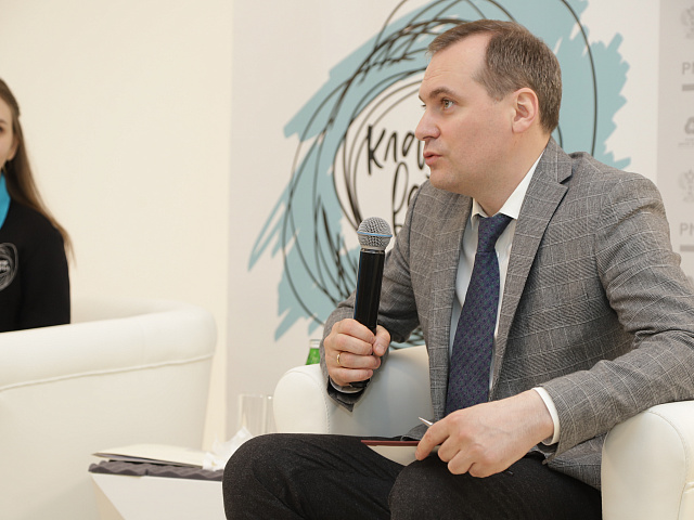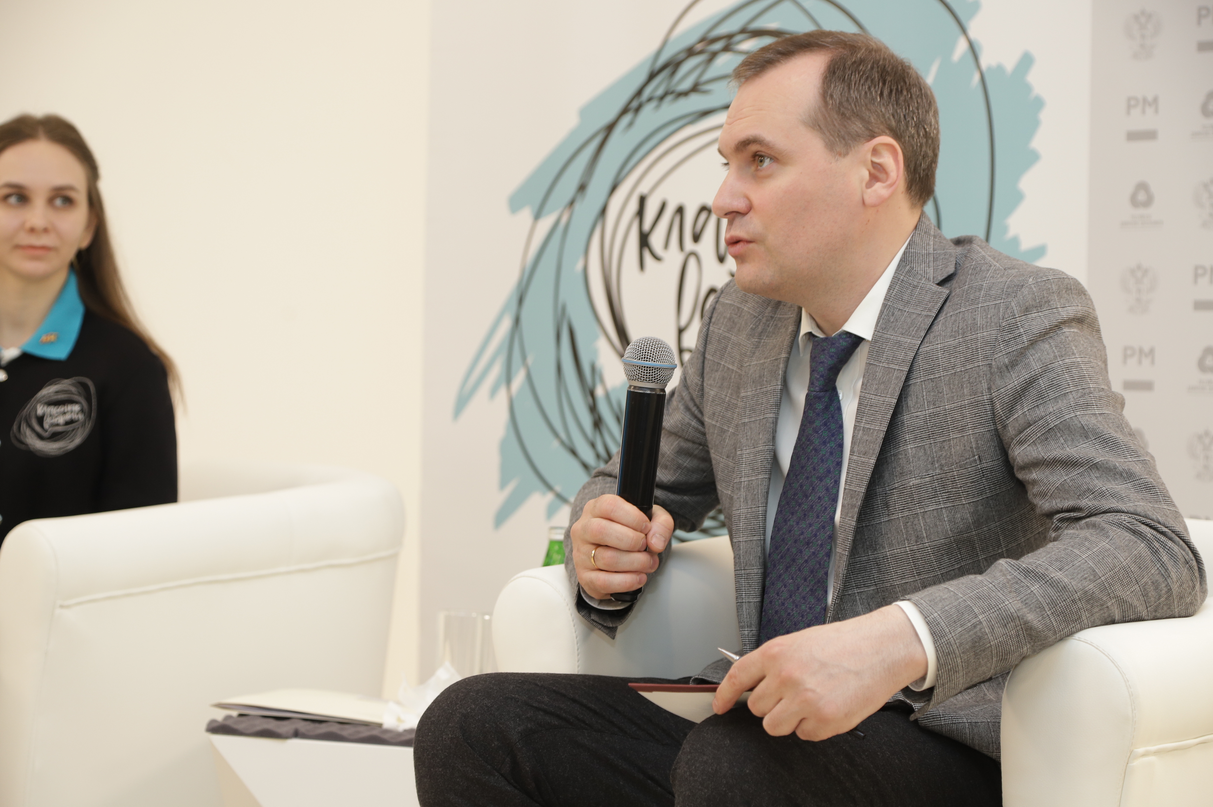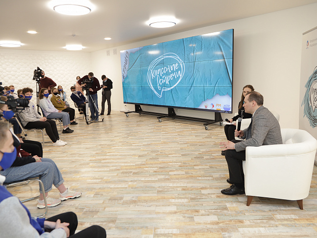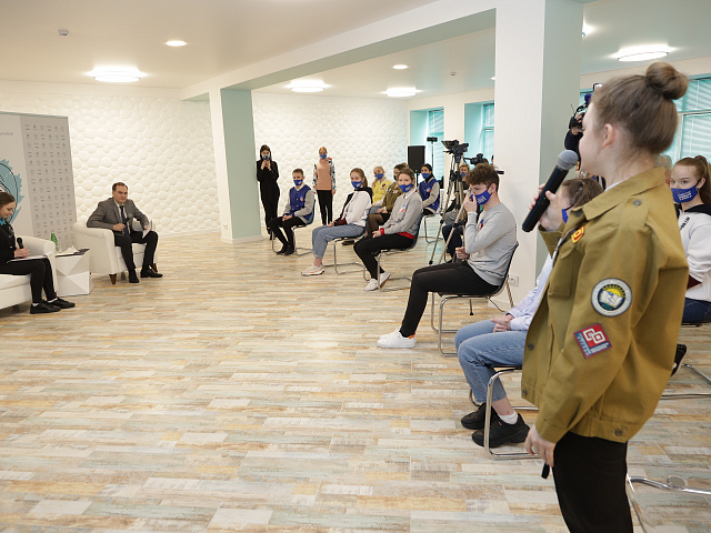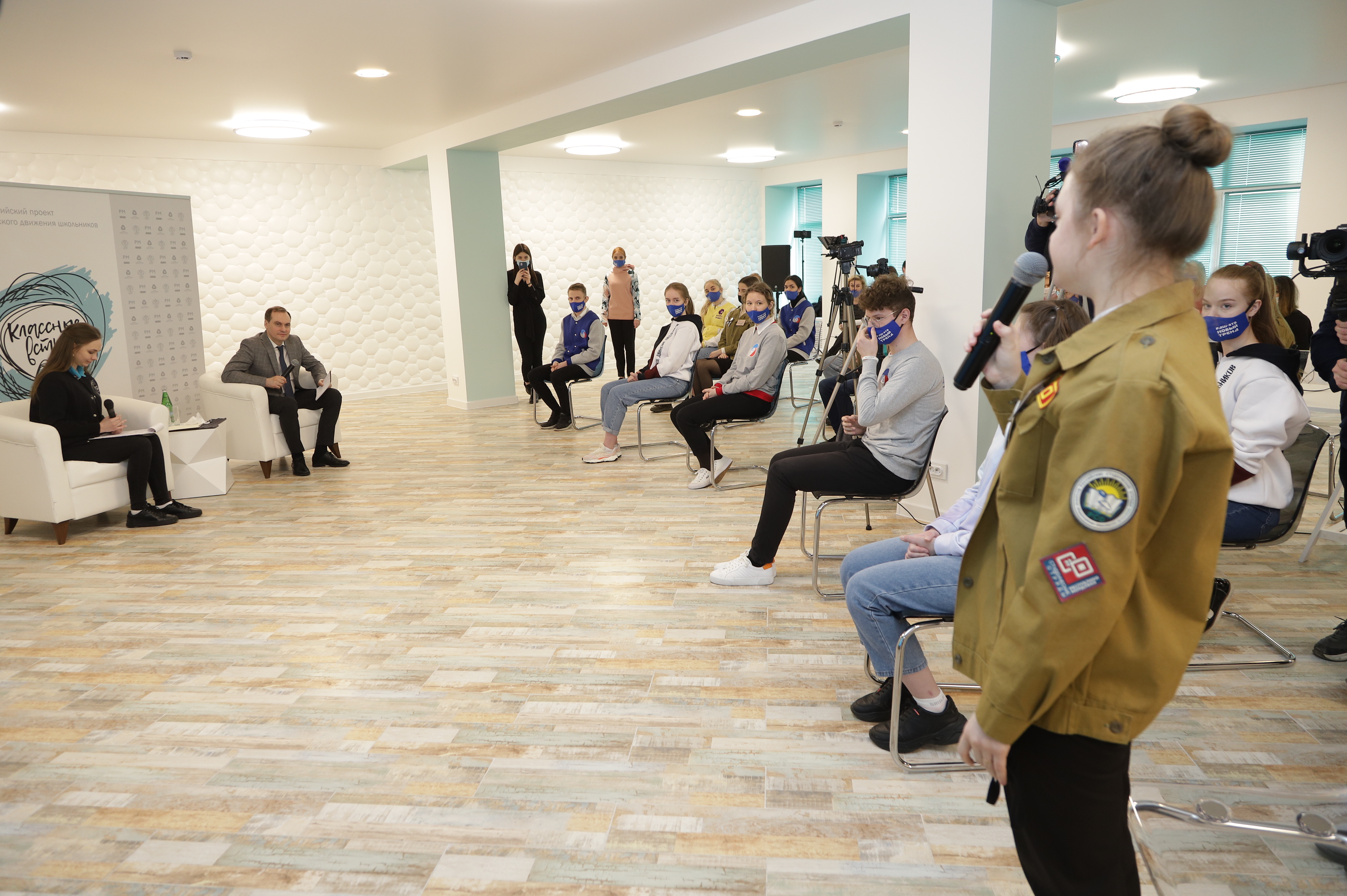 После коллективной фотосессии Артем Алексеевич принял участие в «классной встрече» с активистами Российского движения школьников и их наставниками вожатыми.