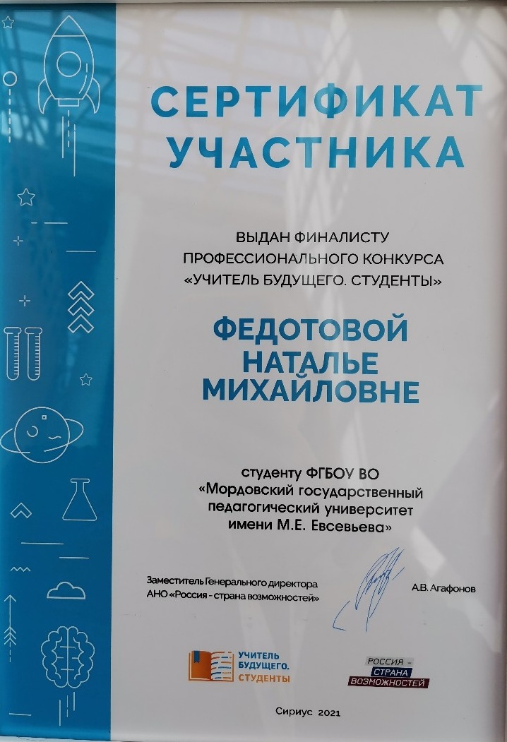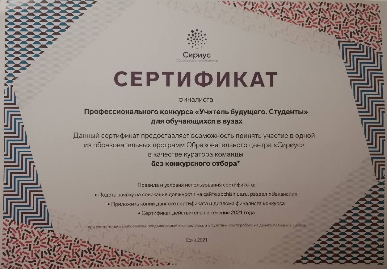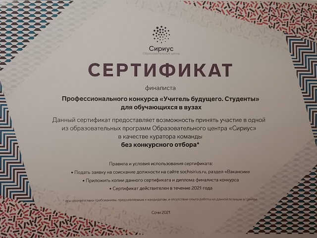 23 апреля в Парке науки и искусства «Сириус» в г. Сочи завершились педагогические соревнования финала всероссийского конкурса «Учитель будущего. Студенты». Данный конкурс – один из проектов президентской платформы «Россия – страна возможностей», реализуется в рамках федерального проекта «Социальные лифты для каждого» национального проекта «Образование». Участниками конкурса стали 152 студента из 47 регионов России.