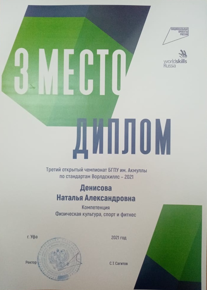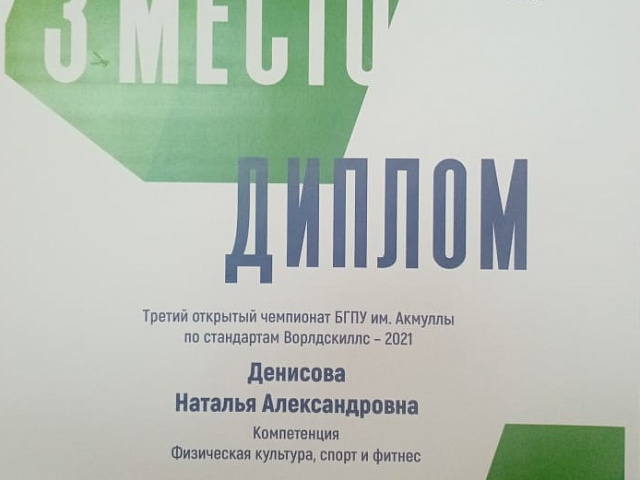 Денисова Наталья Александровна, студентка 4 курса факультета физической культуры - 3 место по компетенции «Физическая культура, спорт и фитнес».