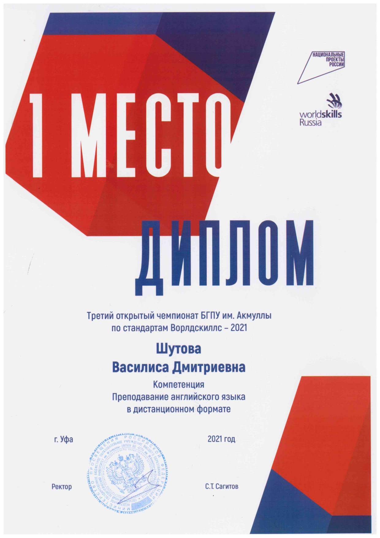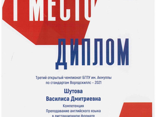 Шутова Василиса Дмитриевна, студентка 5 курса факультета иностранных языков - 1 место по компетенции «Преподавание английского языка в дистанционном формате»;