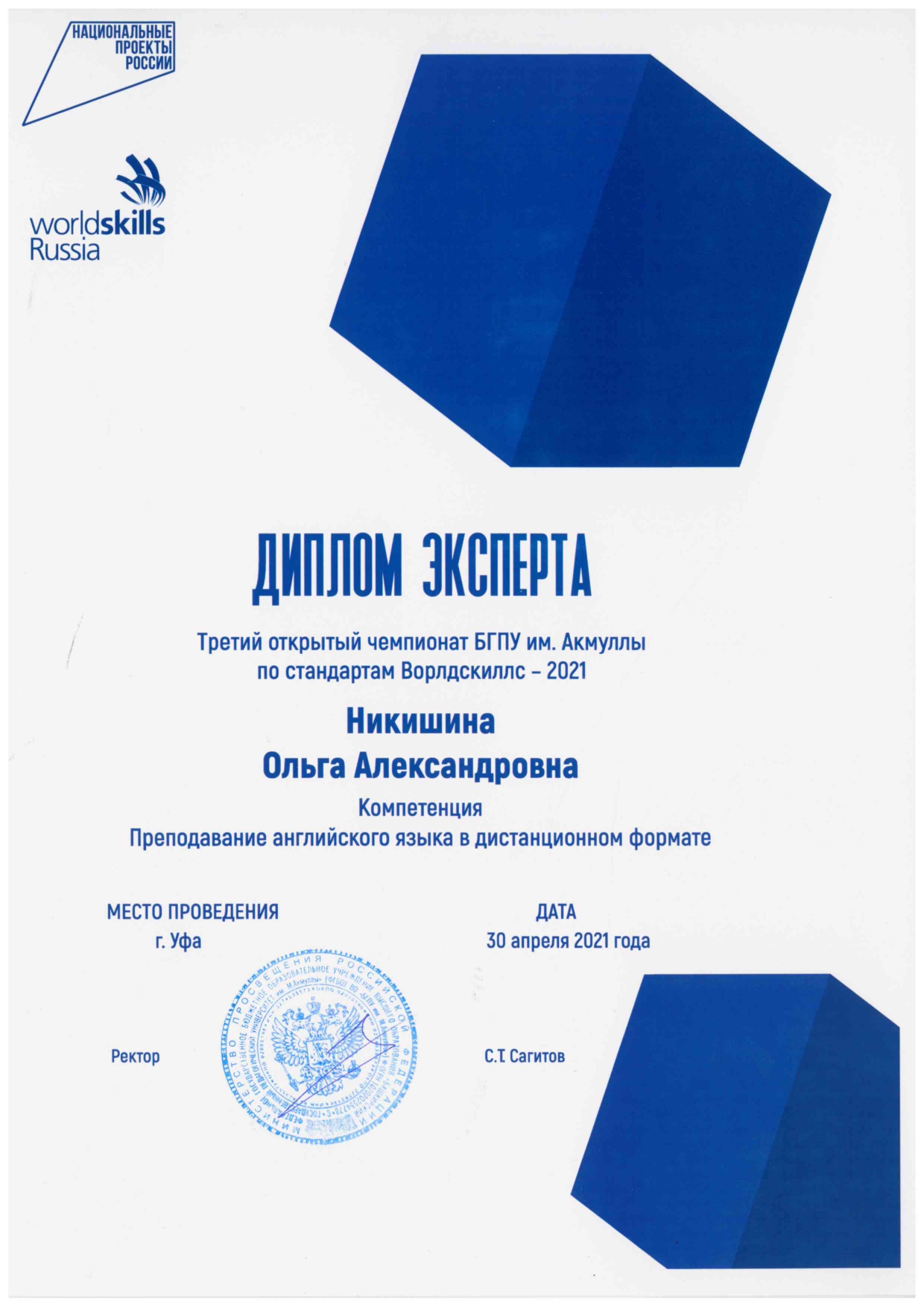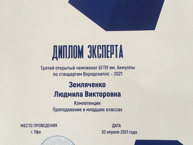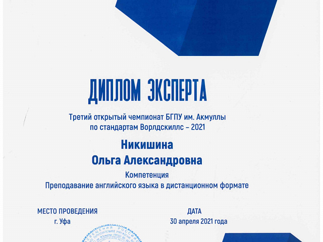 «Участие WorldSkills - отличная возможность обменяться опытом с представителями других вузов со всей России. При участии в соревнованиях пригодился и опыт вузовского чемпионата на базе МГПУ в 2019 году. Выполнение конкурсных заданий помогло усовершенствовать навыки работы с онлайн - сервисами для преподавания английского языка. Данный опыт особенно актуален в условиях пандемии, когда все обучение перешло в дистанционный формат. Моё пожелание студентам: не бояться участия в подобных мероприятиях, потому что наш вуз даёт замечательные фундаментальные знания и развивает профессиональные компетенции для достижения высоких результатов».