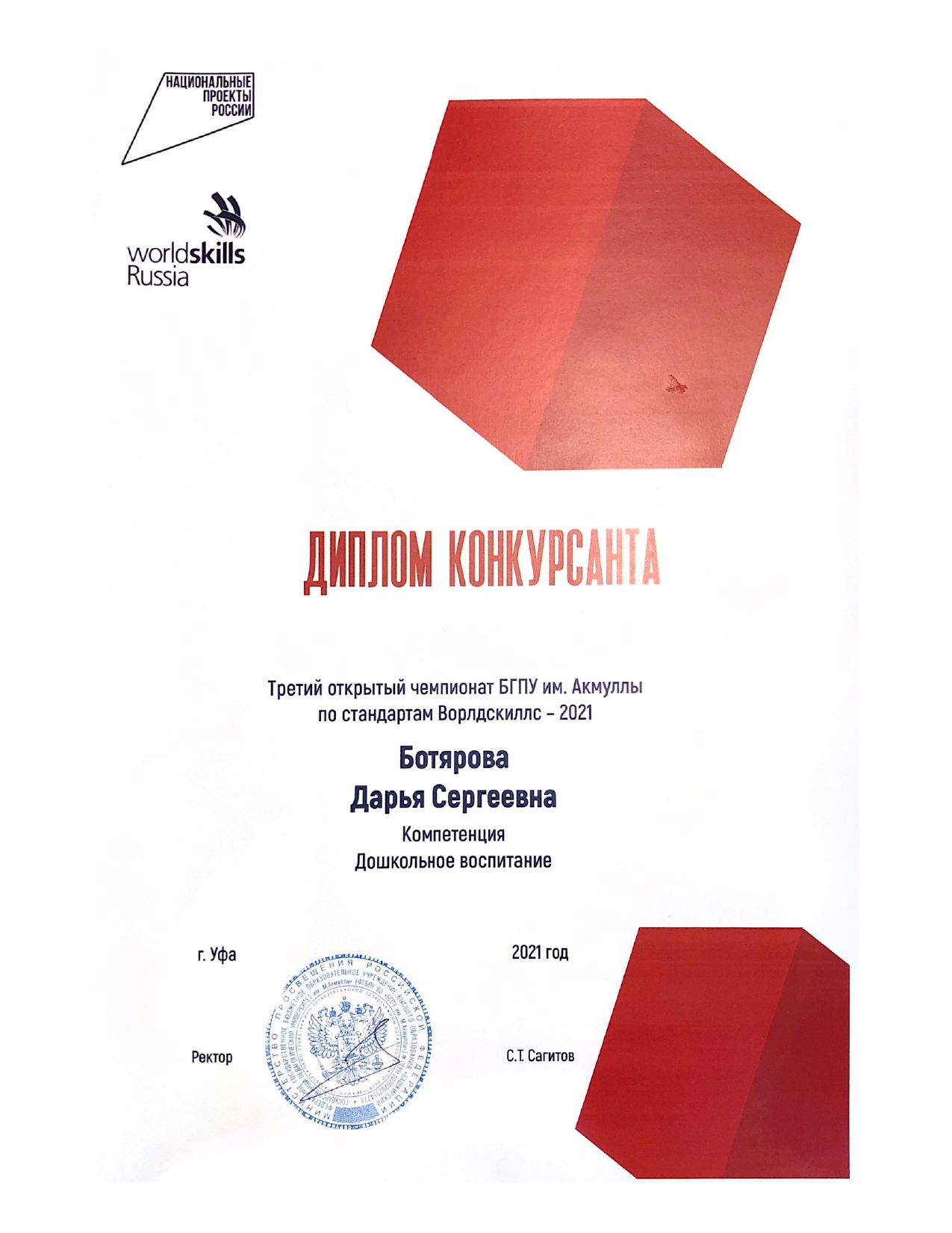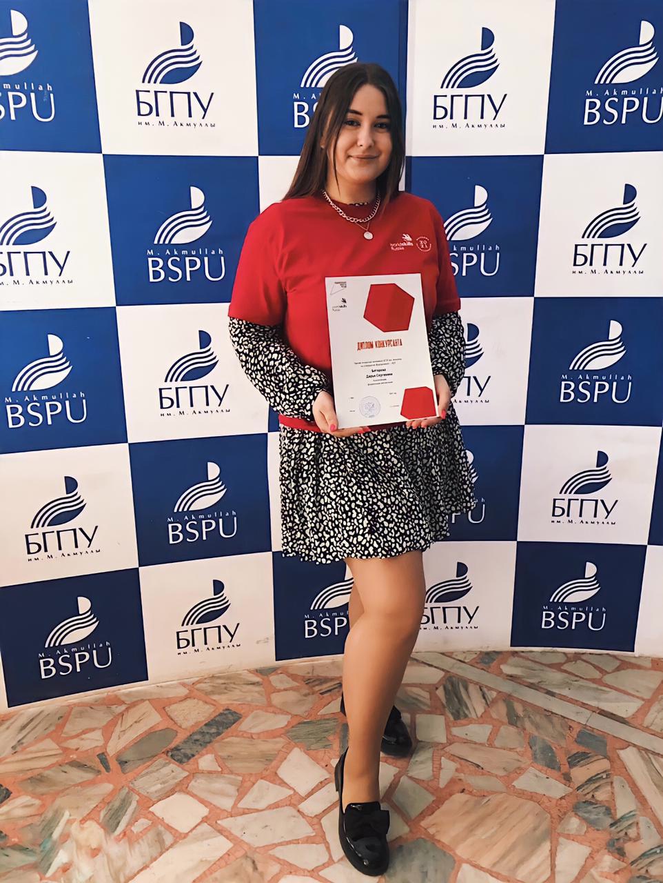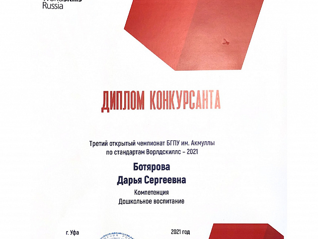 Дипломом конкурсанта по компетенции «Дошкольное образование» также отмечена Ботярова Дарья Сергеевна, студентка 4 курса факультета среднего профессионального образования.