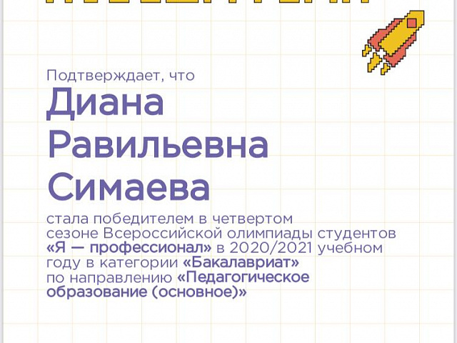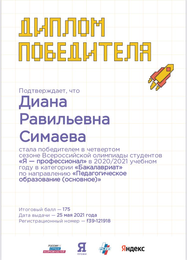 Победителем в номинации «Педагогическое образование (основное)» стала студентка 3 курса естественно-технологического факультета Симаева Диана Равильевна.