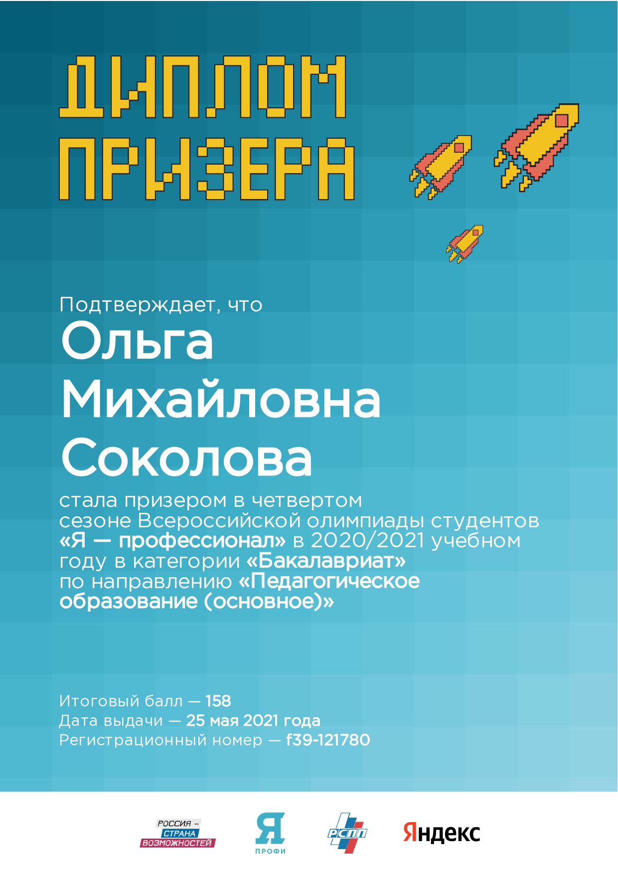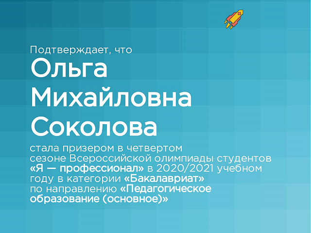 Призером в номинации «Педагогическое образование (основное)» стала студентка 3 курса естественно-технологического факультета Соколова Ольга Михайловна.