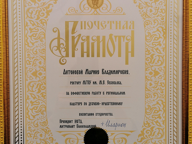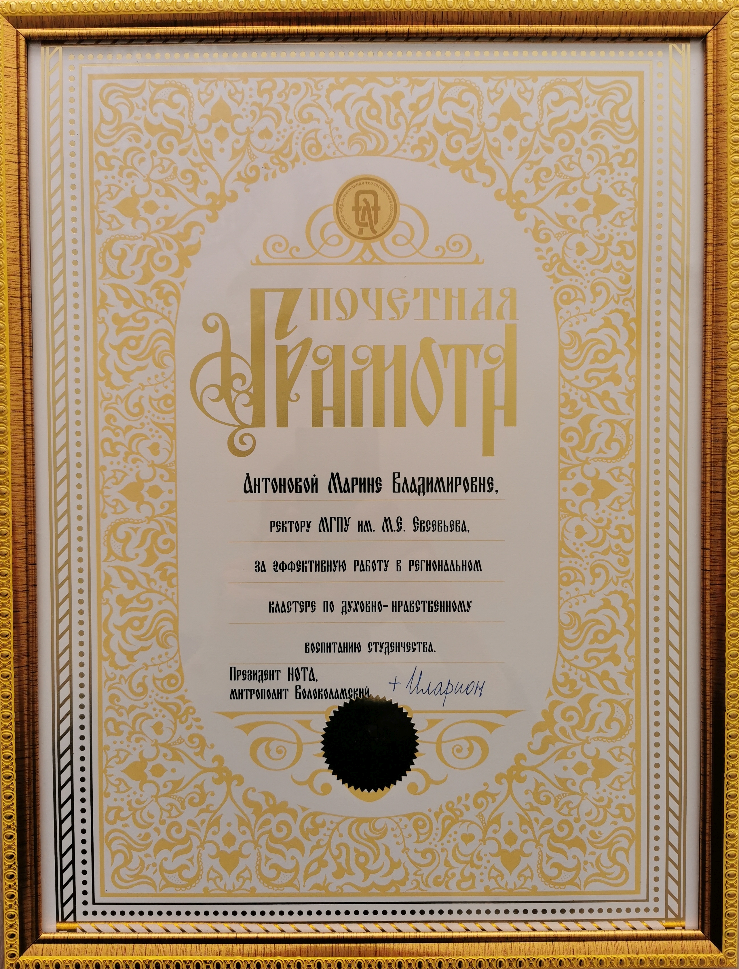 Митрополит Саранский и Мордовский Зиновий вручил Марине Владимировне Антоновой Почетную грамоту Научно-образовательной теологической ассоциации (НОТА), особо отметив эффективную работу педагогического университета по духовно-нравственному воспитанию студенчества в рамках регионального кластера.