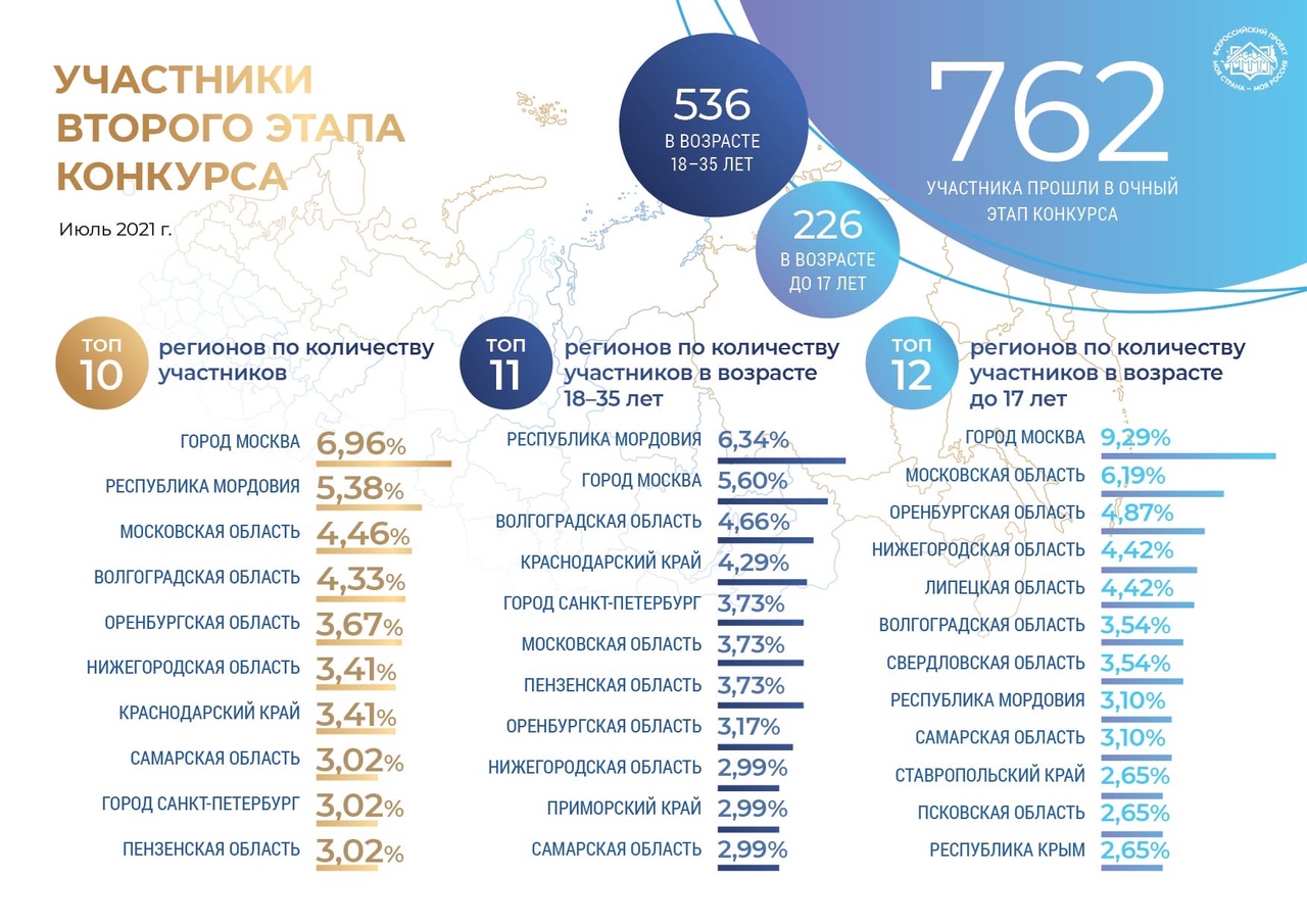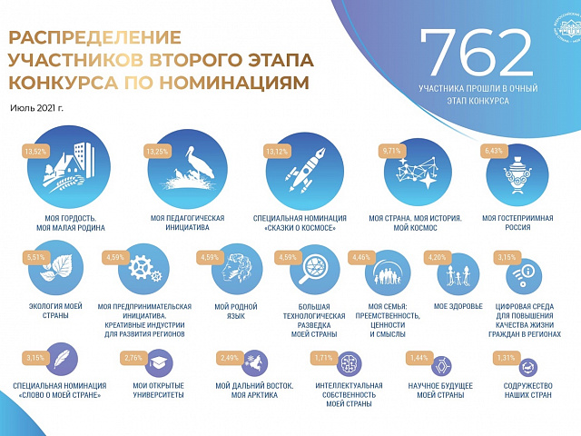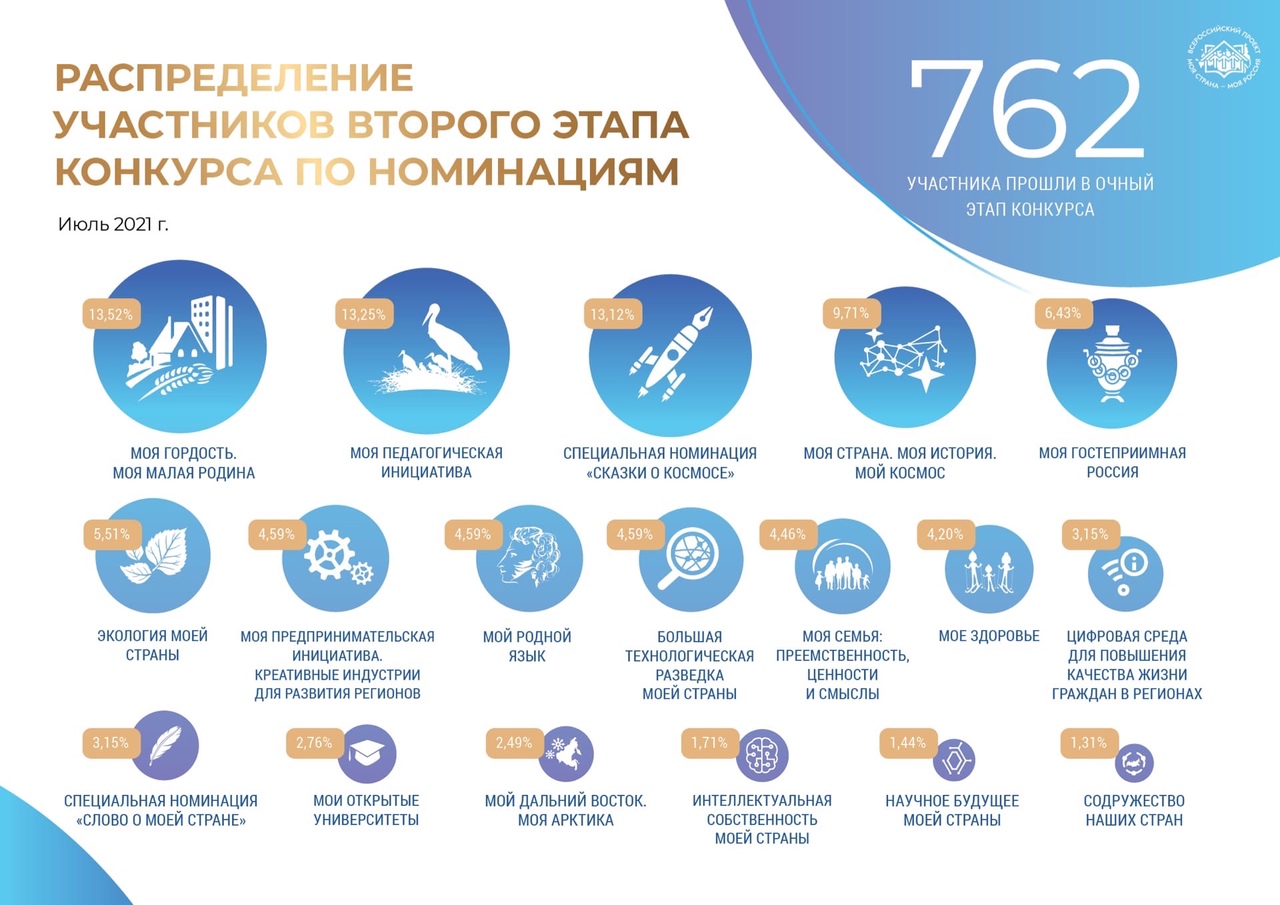 В финал всероссийского конкурса «Моя страна – моя Россия», одного из проектов президентской платформы «Россия – страна возможностей», успешно прошли 762 участника, из них 536 участников – в возрасте от 18 до 35 лет и 226 – в возрасте до 17 лет. Теперь финалистам предстоит очная защита своих проектных инициатив.