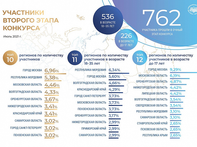 Из 536 участников второй возрастной категории от 19 до 35 лет, набравших наибольшее количество баллов по итогам заочной экспертизы, 34 человека представляют Республику Мордовия. Из них 25 участников – представители МГПУ имени М. Е. Евсевьева.