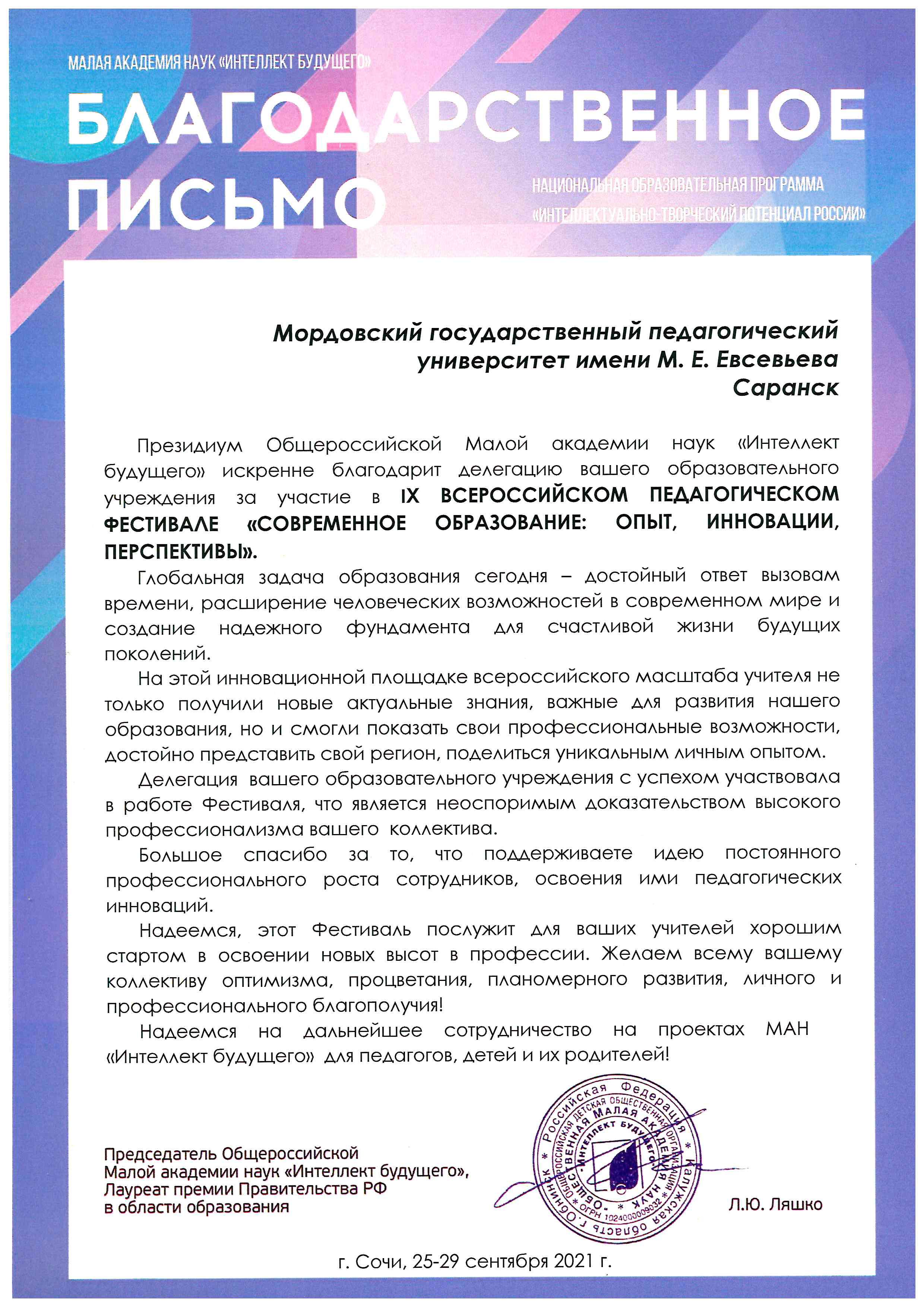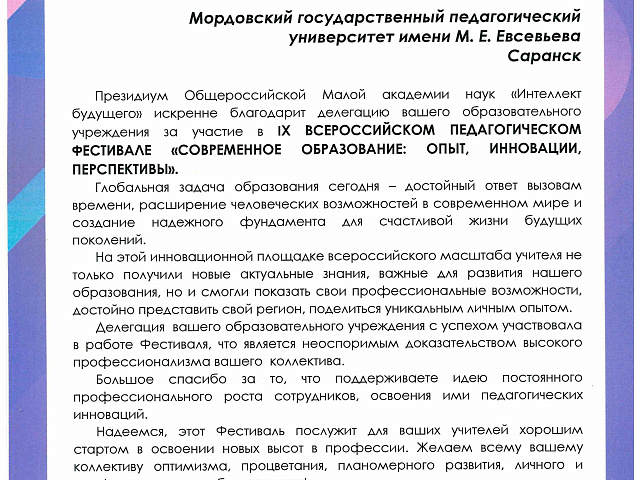На торжественном заседании фестиваля Мордовскому государственному педагогическому университету вручено Благодарственное письмо за поддержку идеи постоянного профессионального роста сотрудников, освоения ими педагогических инноваций.