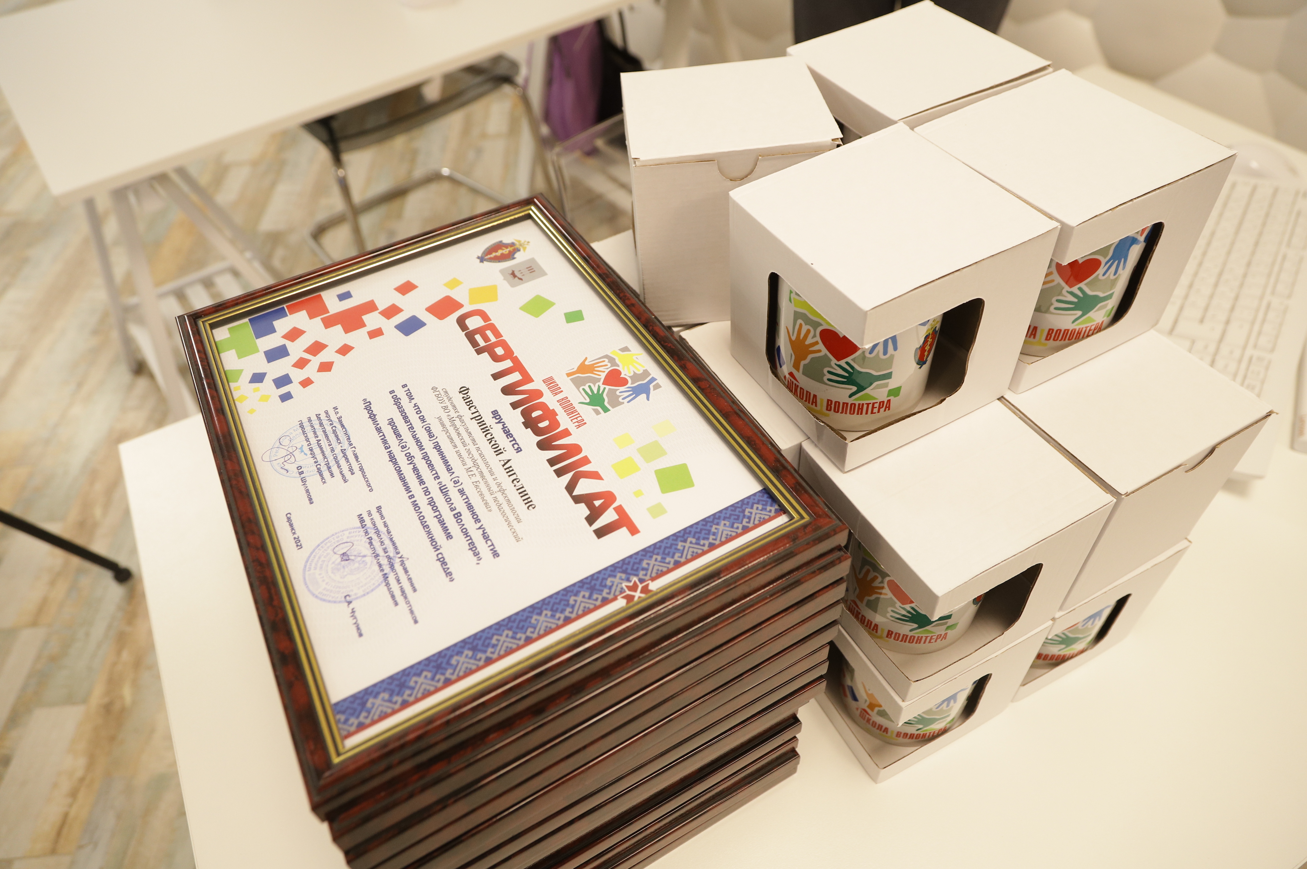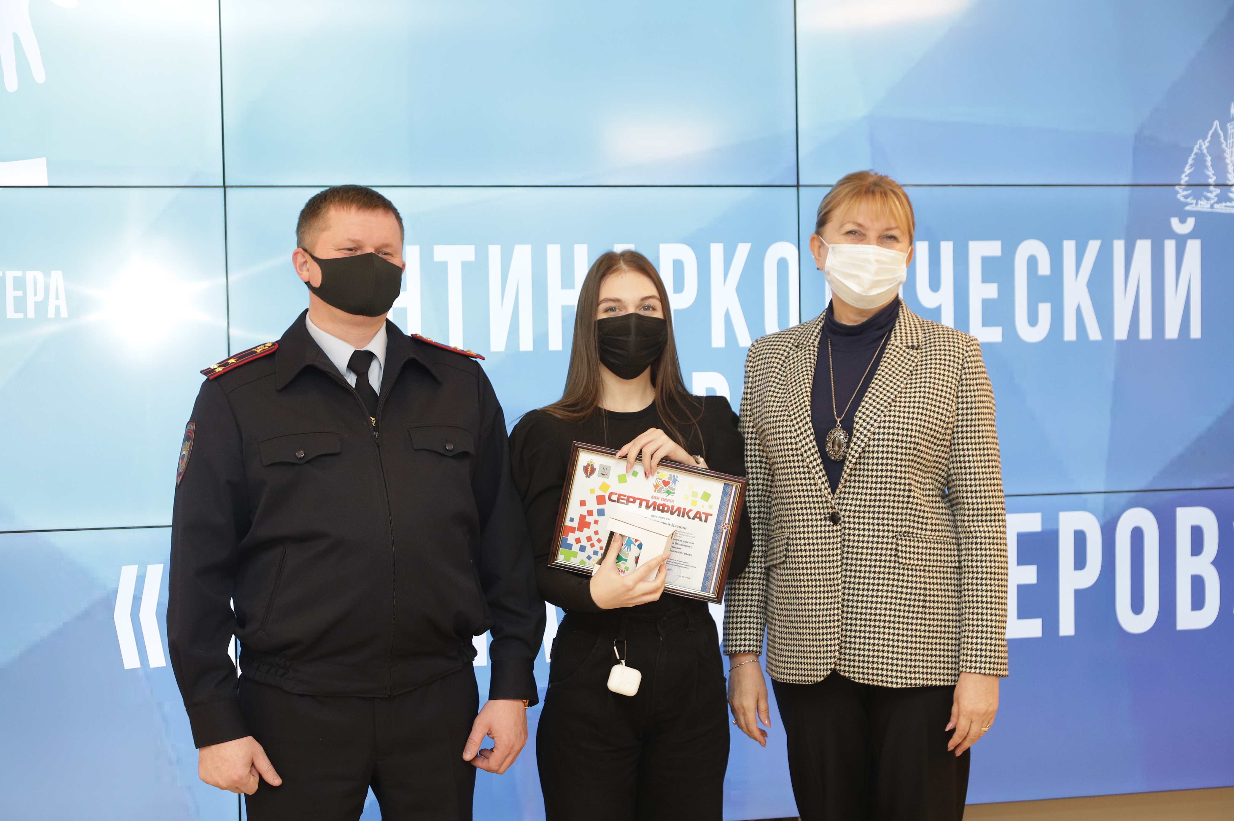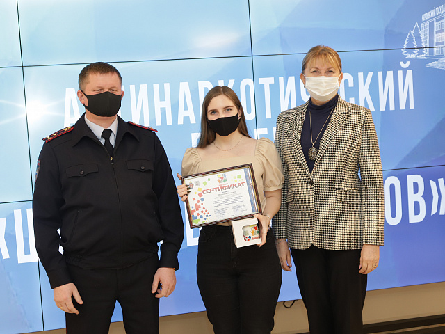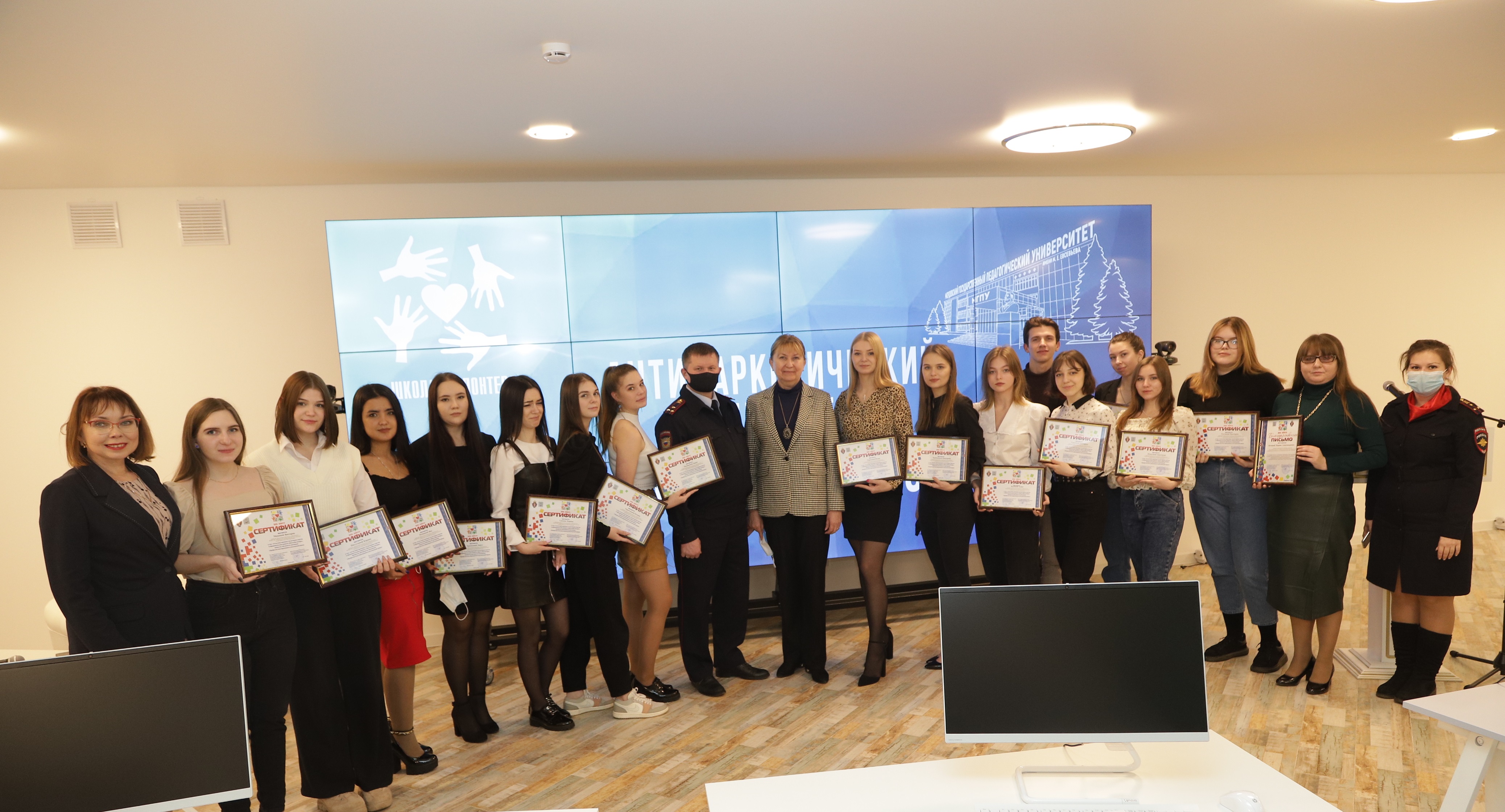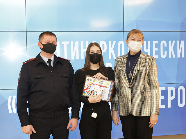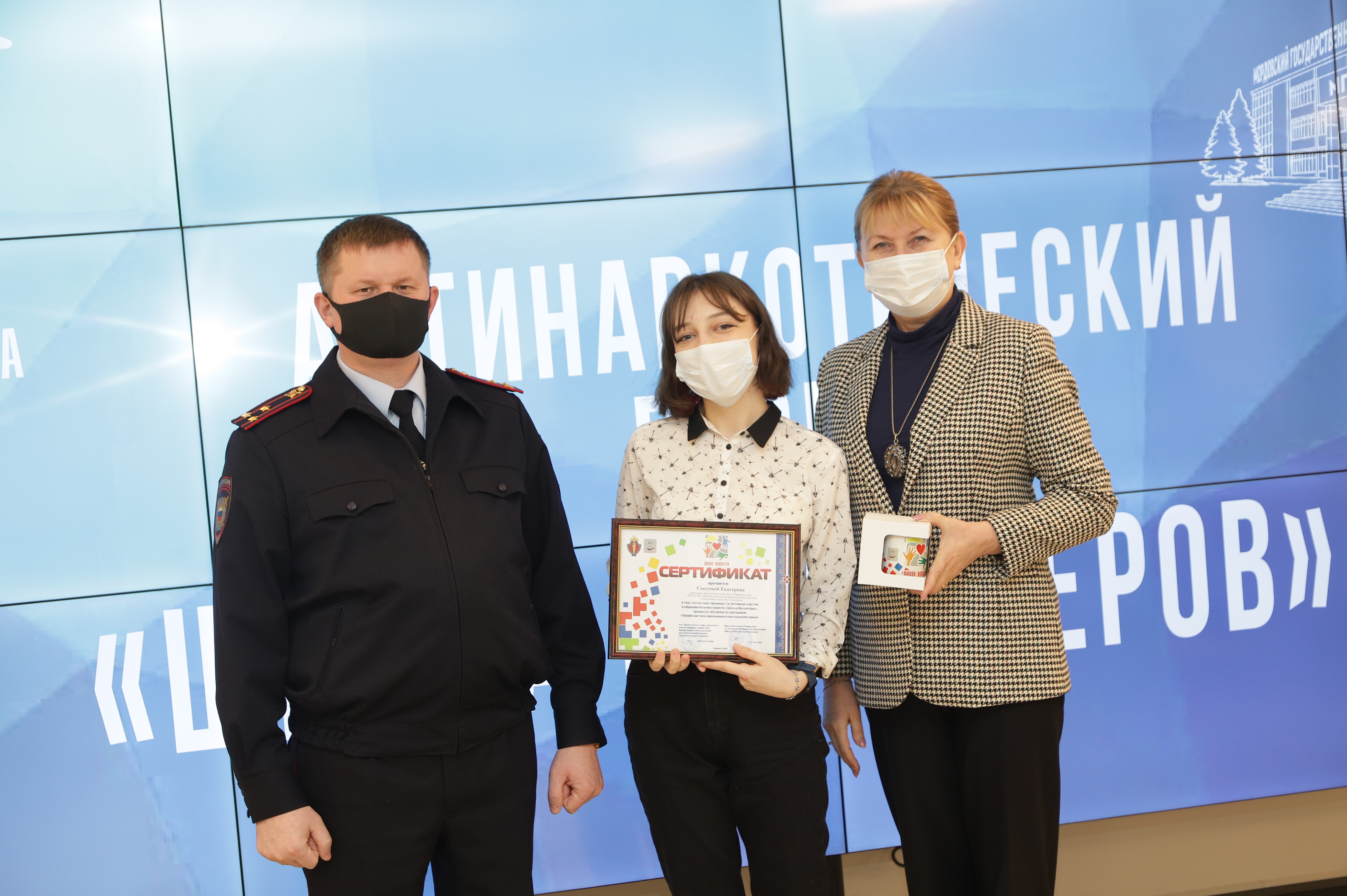 Поздравили и вручили сертификаты об успешном прохождении обучения будущим волонтерам Ручина Оксана Евгеньевна, заместитель директора департамента по социальной политике администрации г. о. Саранск, секретарь антинаркотической комиссии г.о. Саранск и Малоземов Сергей Семенович, заместитель начальника управления по контролю за оборотом наркотиков МВД по РМ, полковник полиции.