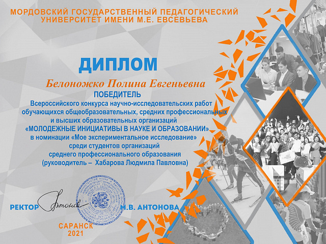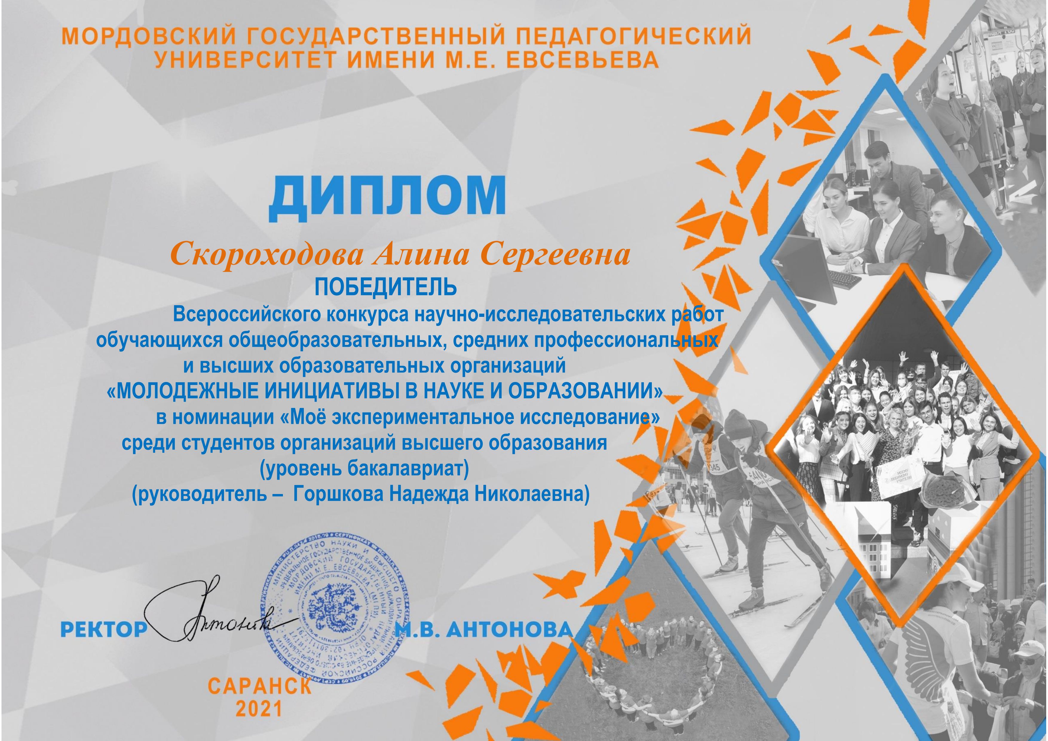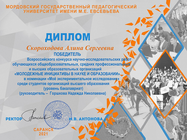 – в номинации «Мое экспериментальное исследование» Скороходова Алина Сергеевна (ФГБОУ ВО «Мордовский государственный педагогический университет имени М. Е. Евсевьева», г. Саранск);