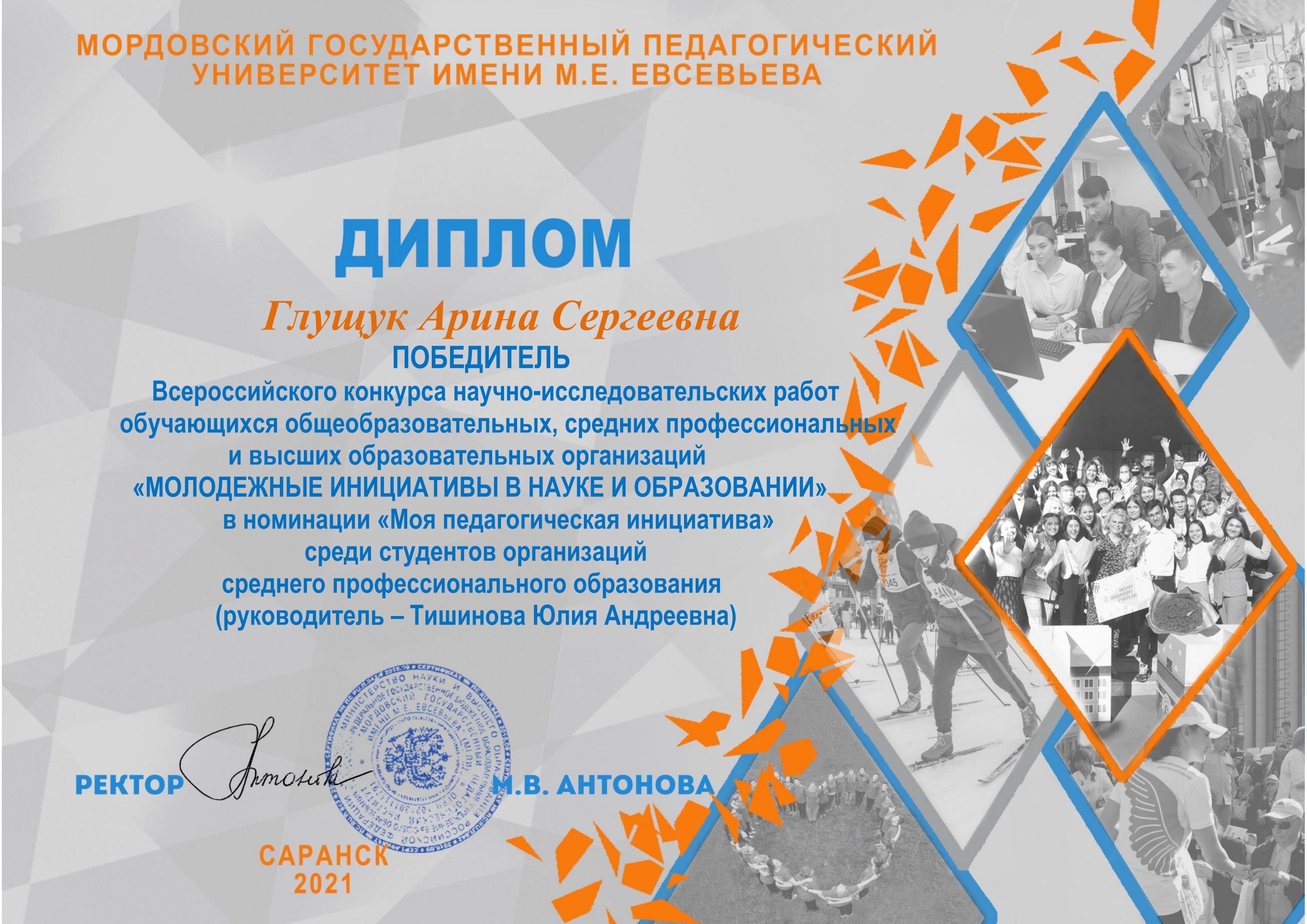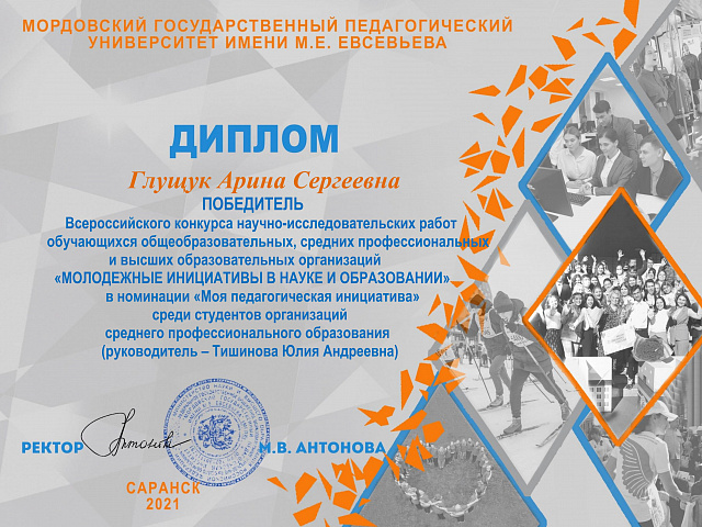 – в номинации «Моя педагогическая инициатива» Глущук Арина Сергеевна ГПОУ «Сыктывкарский гуманитарно-педагогический колледж имени И.А. Куратова», г. Сыктывкар Республика Коми).