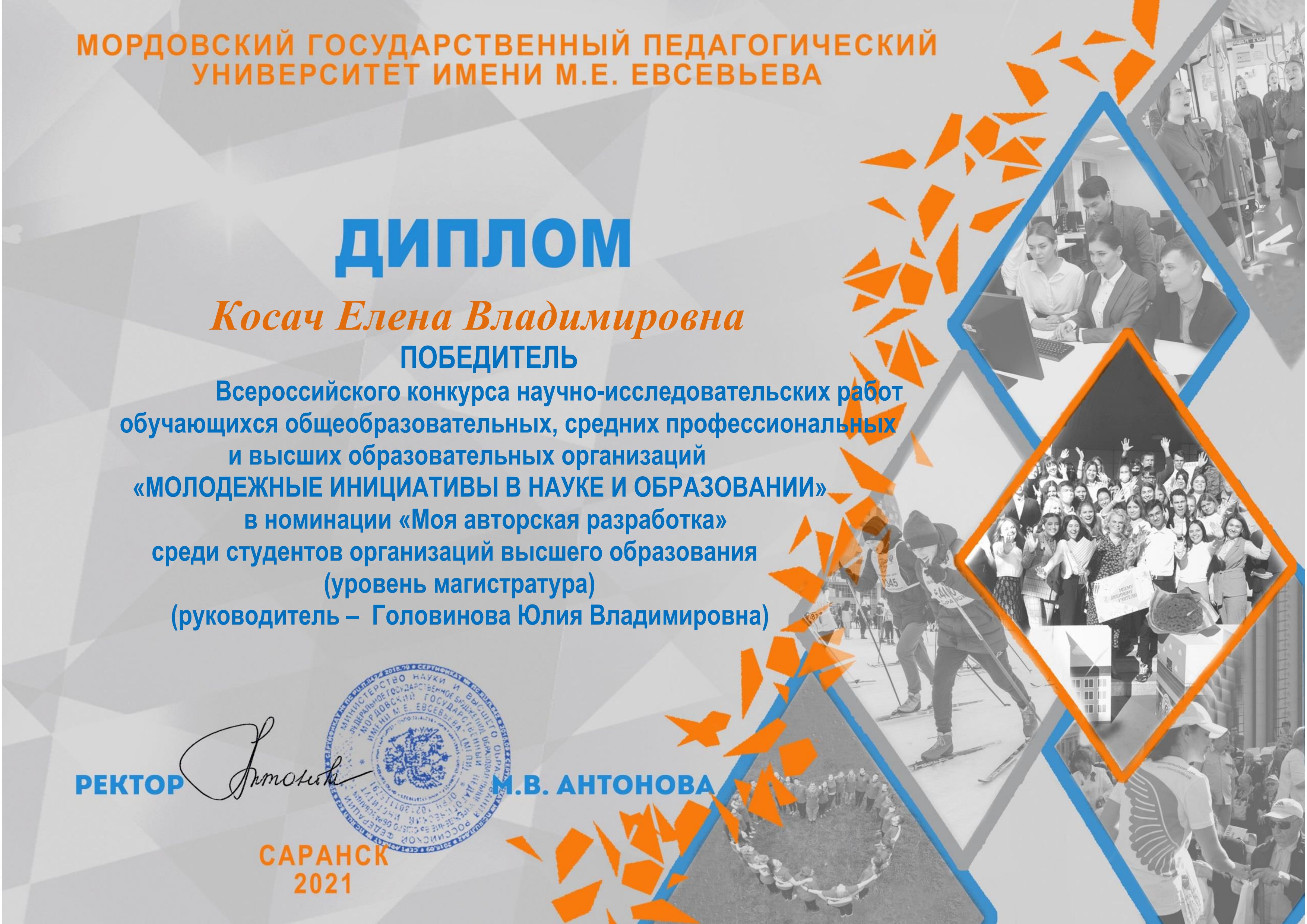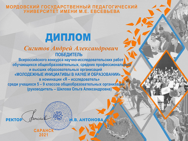 – в номинации «Я-исследователь» Калачева Оксана Олеговна (ФГБОУ ВО «Мордовский государственный педагогический университет имени М.Е. Евсевьева», г. Саранск);