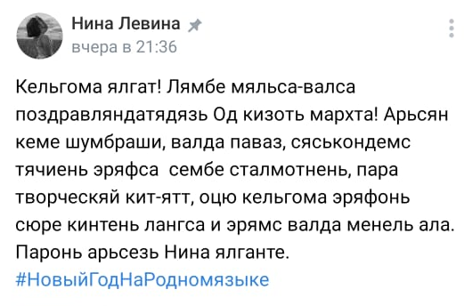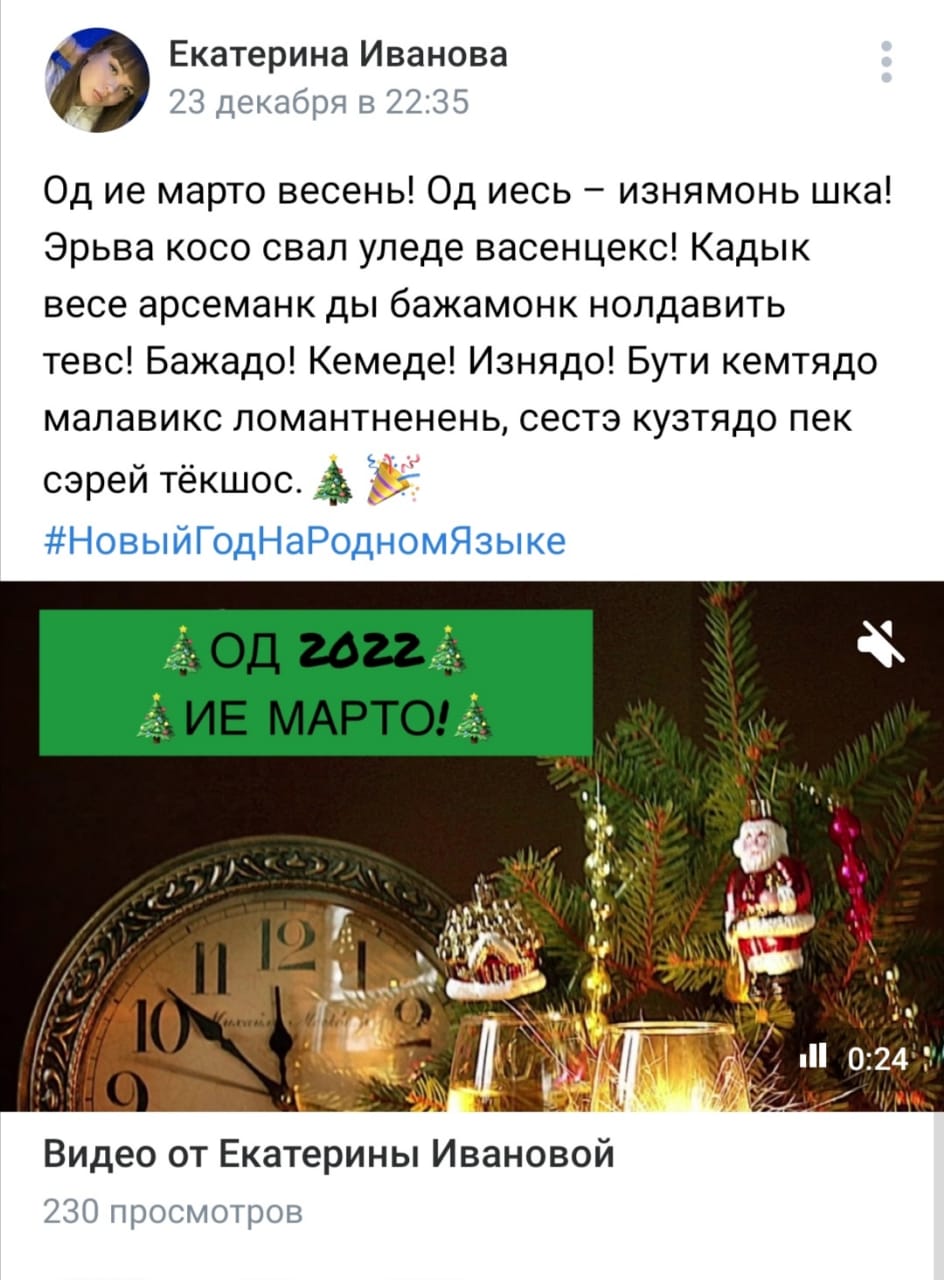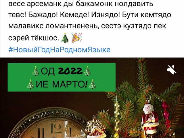 Участники флешмоба поздравили всех жителей с Наступающим Новым 2022 годом на разных языках – русском, мокшанском, эрзянском, татарском, туркменском и других, опубликовав в социальных сетях «Вконтакте» видео- или текстовое сообщение с поздравлением на своем родном языке с хештэгом «#НовыйГодНаРодномЯзыке».